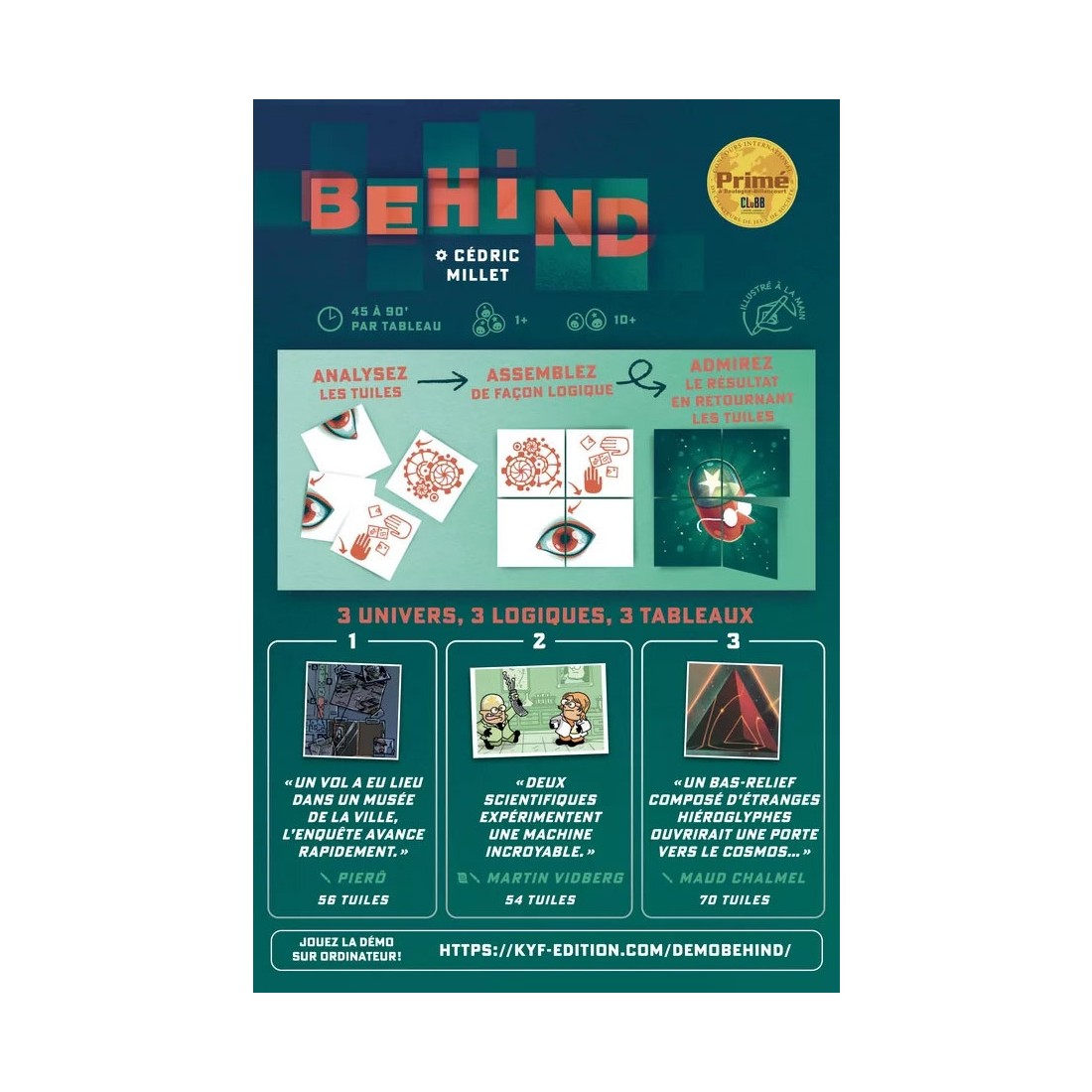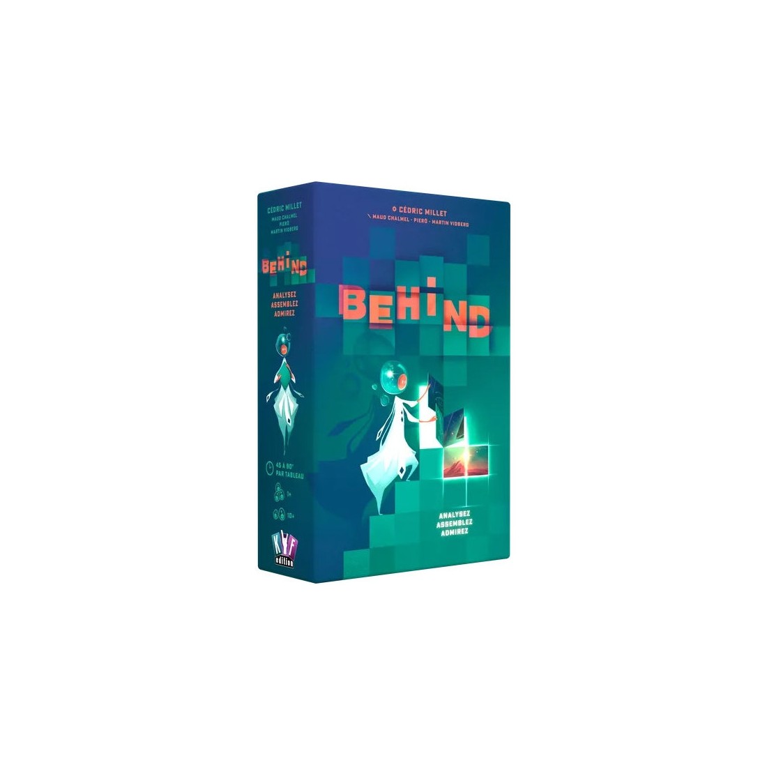 Behind est une expérience coopérative très originale : en solo mais aussi à plusieurs, échangez, débattez et laissez-vous immerger dans ces 3 tableaux à la mécanique inédite. Pas besoin d'apprendre des règles, choisissez un compartiment, sortez les tuiles sans les retourner et jouez instantanément !