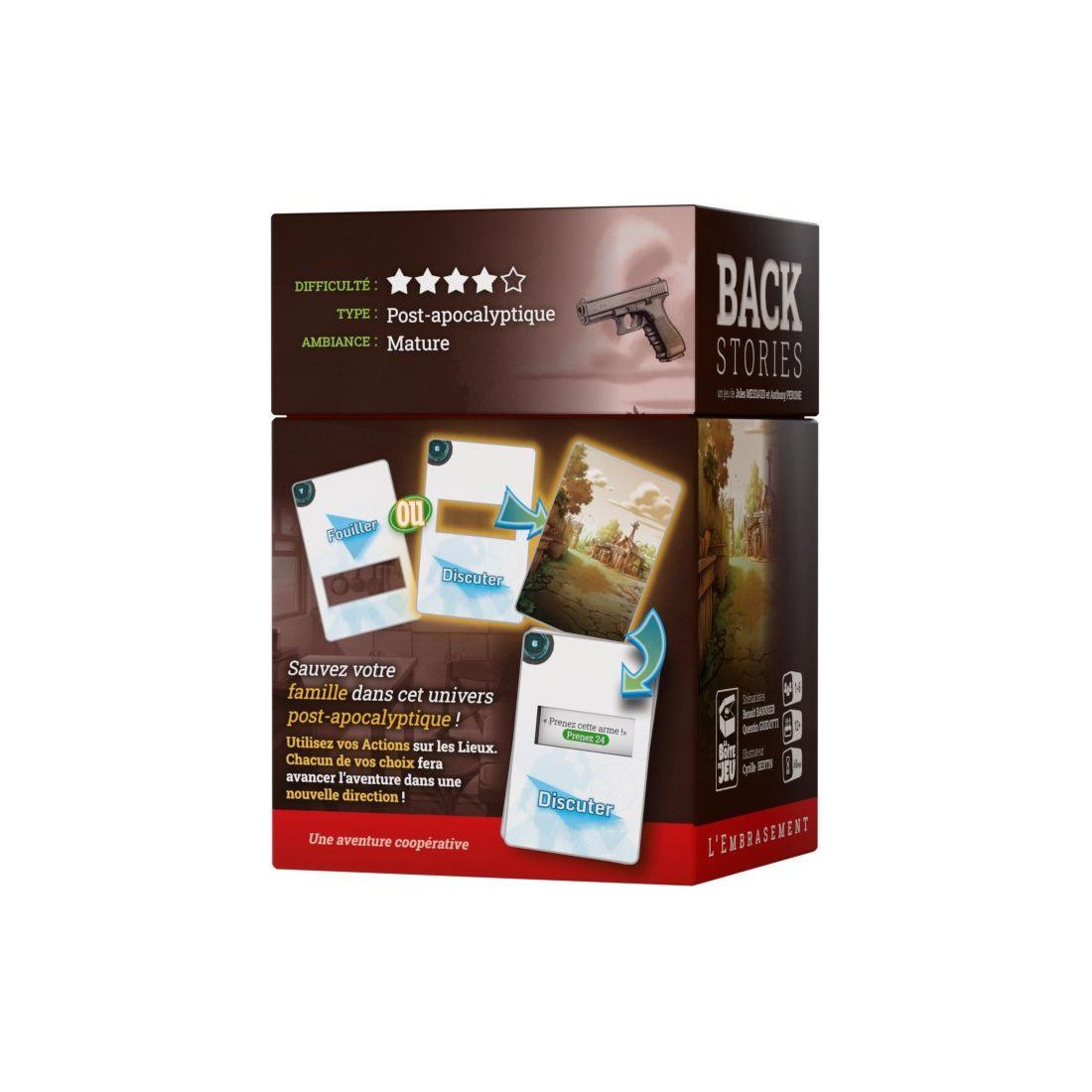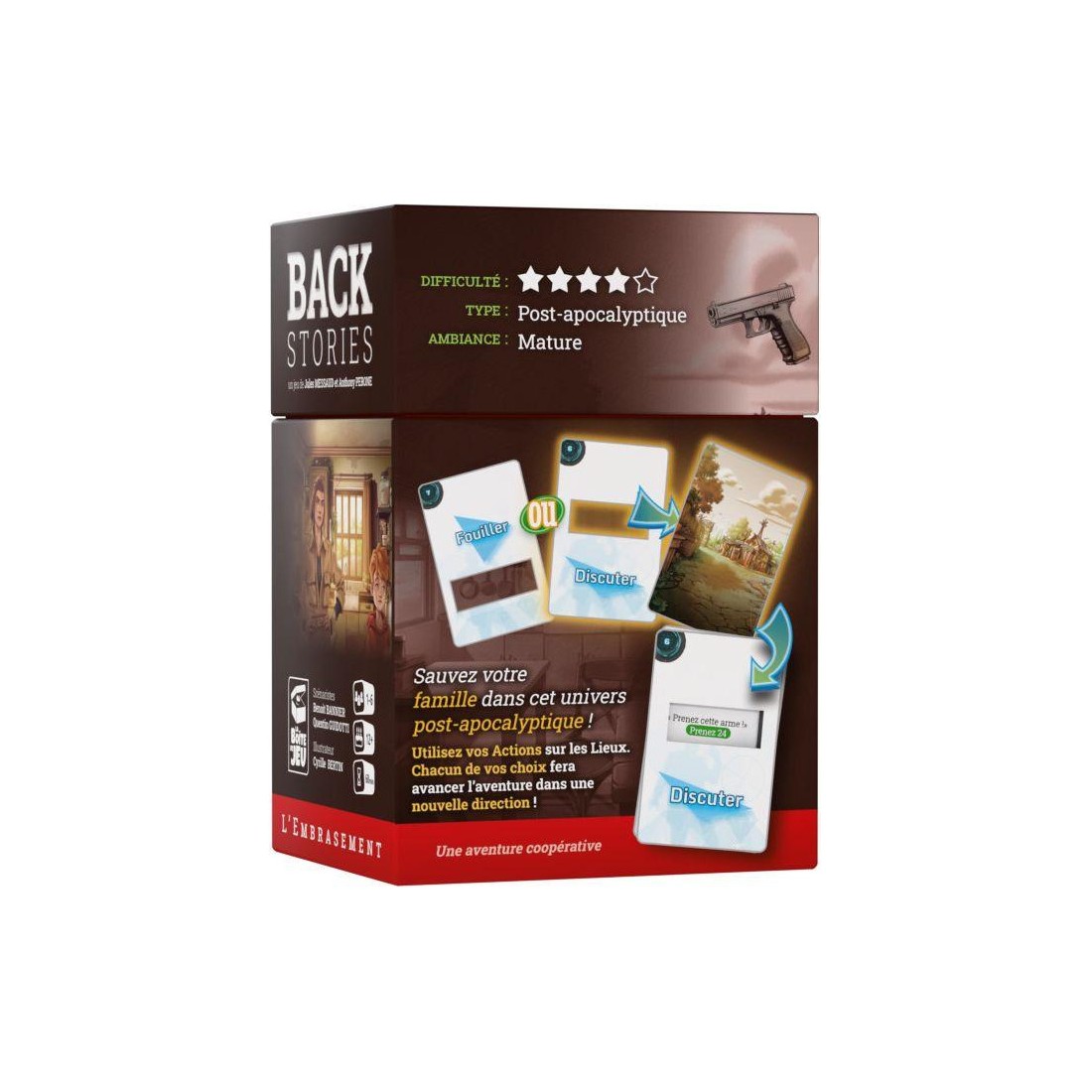 Backstories est un jeu d'aventure coopératif fonctionnant à la manière d'un jeu vidéo point and click. Grâce à un système de cartes trouées, révélez les conséquences de vos choix. Choisissez une carte Action (Chercher, Parler, Explorer, etc.), placez-la au dos d'une carte Lieu, et découvrez le résultat de votre choix !