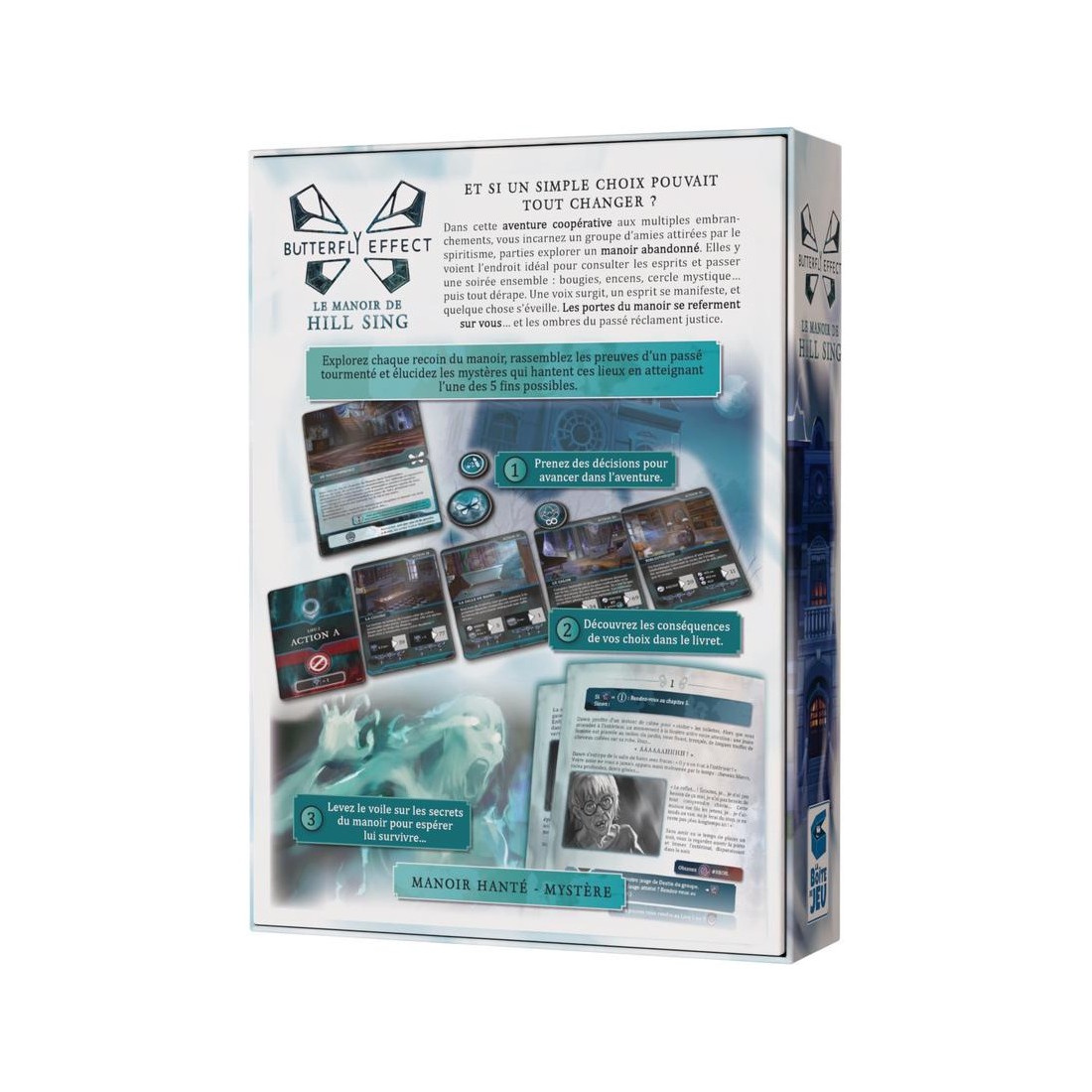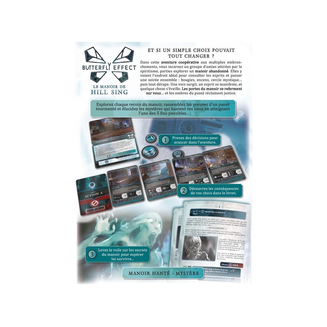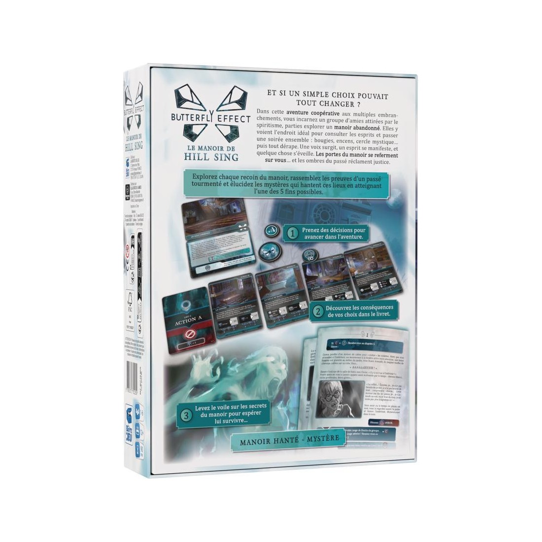 Votre objectif : rassembler les fragments d’histoire, lever le voile sur le passé tourmenté du manoir et percer ses secrets pour espérer survivre. Le jeu propose 5 fins possibles, toutes influencées par vos choix et par la manière dont vous aurez affronté les esprits. Grâce à ses cartes Rencontre, à son ambiance oppressante et à ses embranchements multiples, Le Manoir de Hill Sing renouvelle la narration horrifique dans le jeu de société, pour une expérience intense et rejouable.