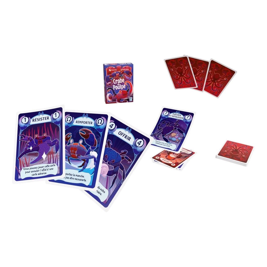Dans le jeu Crabe vs Poulpe, la guerre fait rage sous les vagues : deux espèces rivales s’affrontent dans un duel de cartes. Chaque joueur incarne soit les Crabes, soit les Poulpes, avec pour objectif de se débarrasser entièrement de son jeu, main et pioche comprises, avant son adversaire.