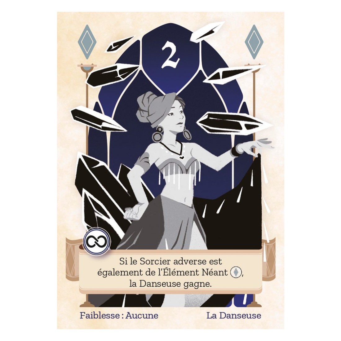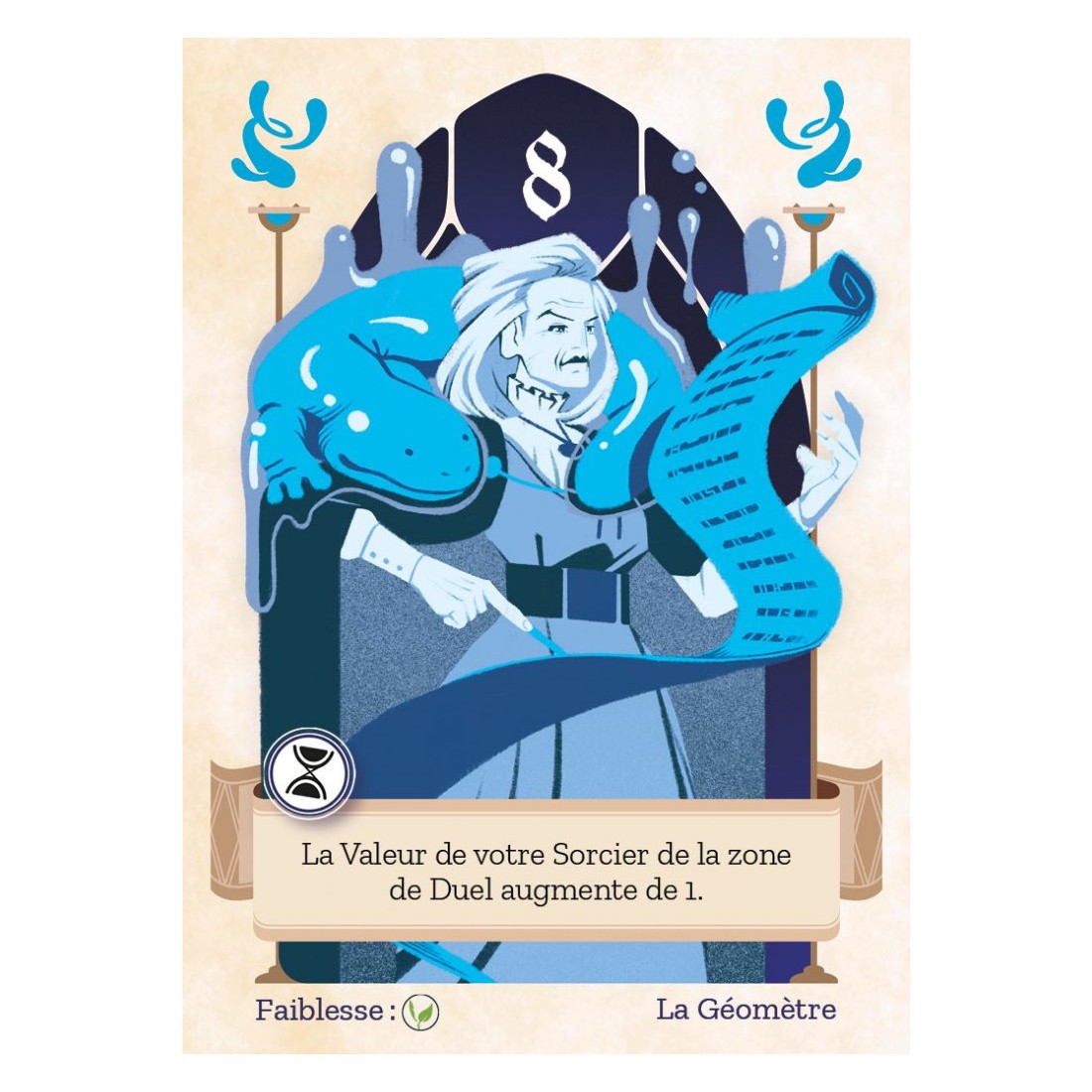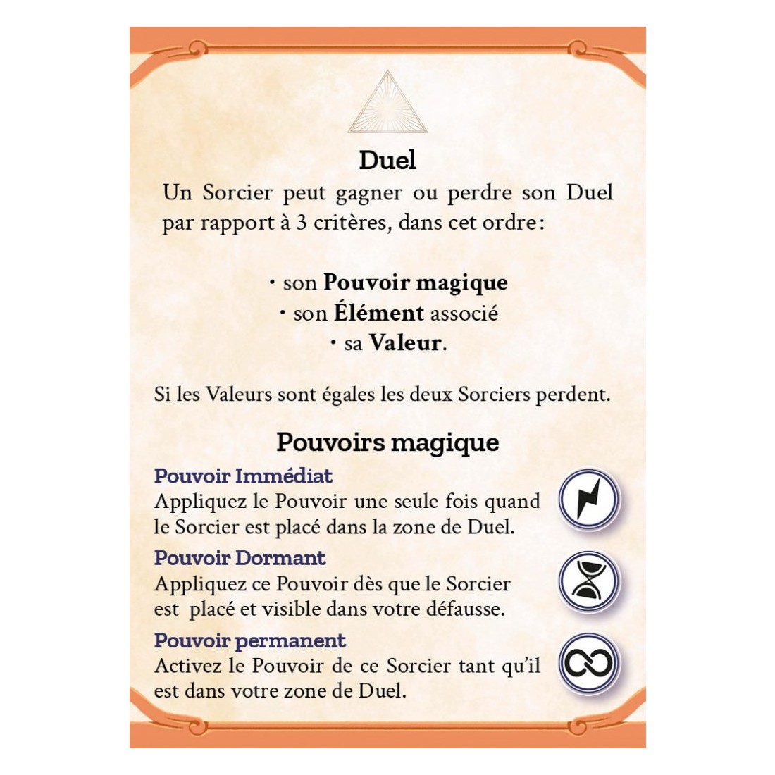 Après cette sélection, chaque joueur dévoile ses cartes une à une, et on regarde qui remporte chacun des duels ainsi formés en fonction de :- l'effet d'un pouvoir (pouvant instantanément mettre au tapis un des sorciers) - l'élément des sorciers (certains étant la faiblesse ultime d'autres) - leur valeur de combat magique (désignant un vainqueur au duel) Le vainqueur d'un duel reste en jeu, alors que le perdant est défaussé (certaines cartes ont un pouvoir actif depuis la défausse).