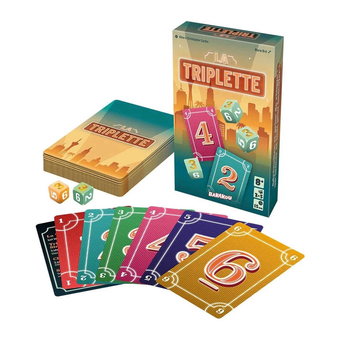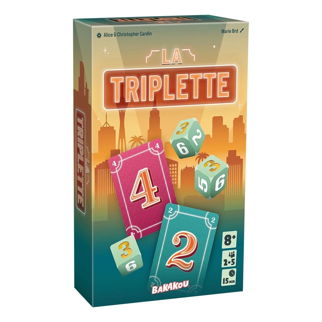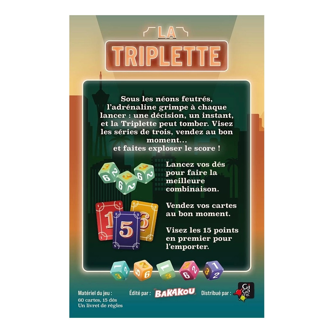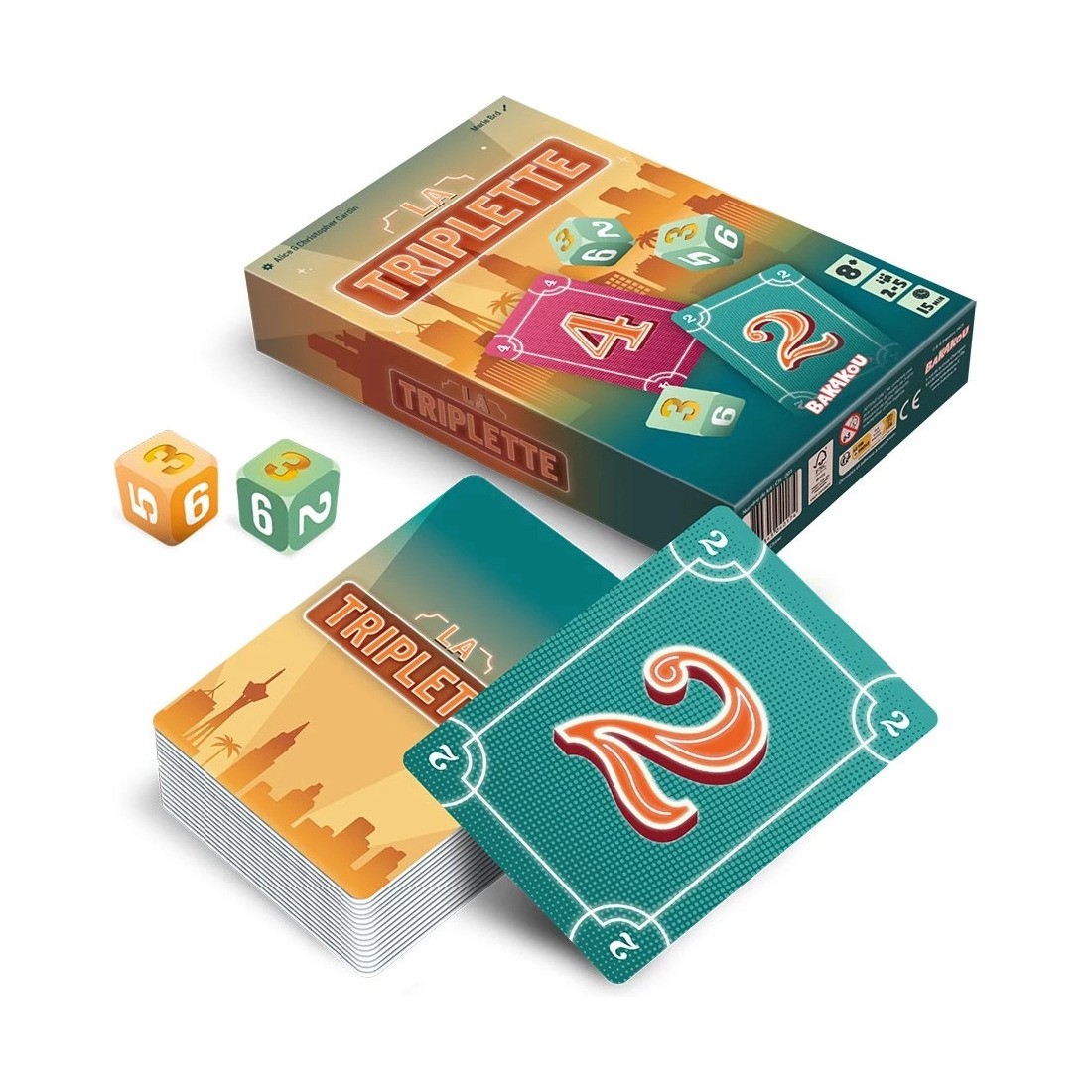 Sous les néons, La Triplette mêle adrénaline, prise de risque et timing chirurgical. À chaque tour, lancez 3 dés, on compare Triplette > Chainette > Simplette, puis, du plus fort au moins bon, chacun prend 1 carte dans la rivière. En fin de tour, vendez jusqu’à 2 séries de 3 cartes : pour un Trio, gardez 1 carte au score ; pour une Suite, gardez la carte du milieu.
