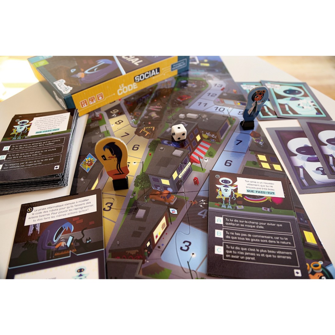 Le code social est conçu pour stimuler le développement des habiletés sociales des enfants de 6 à 10 ans. Le jeu présente des mises en situation qui les amènent à se mettre à la place des personnes pour réfléchir aux comportements appropriés qu’il est possible d’adopter dans ces situations.