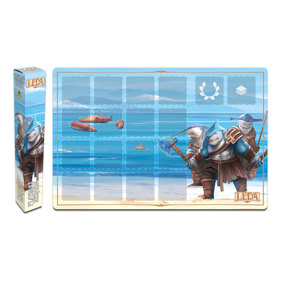 Sous la surface, tout semble immobile… puis soudain, les puissants requins surgissent, bien décidés à en découdre... Le Tapis de jeu Requins est un accessoire officiel conçu pour accompagner vos parties de Leda et enrichir votre confort de jeu. Dédié au clan des Requins, il reprend l’identité visuelle de cette faction puissante pour apporter une vraie présence sur la table, tout en renforçant l’immersion dans l’univers du jeu.