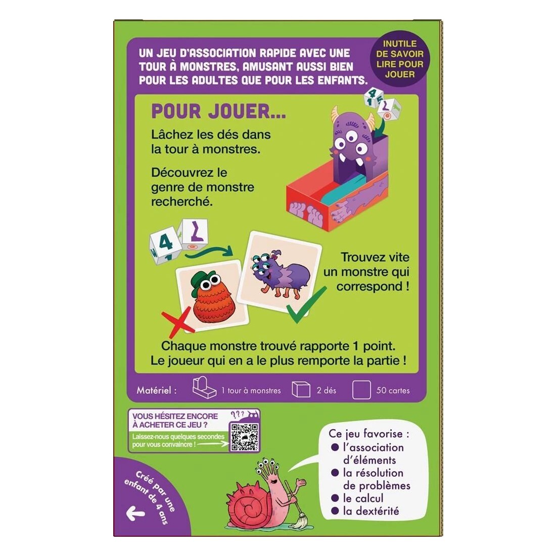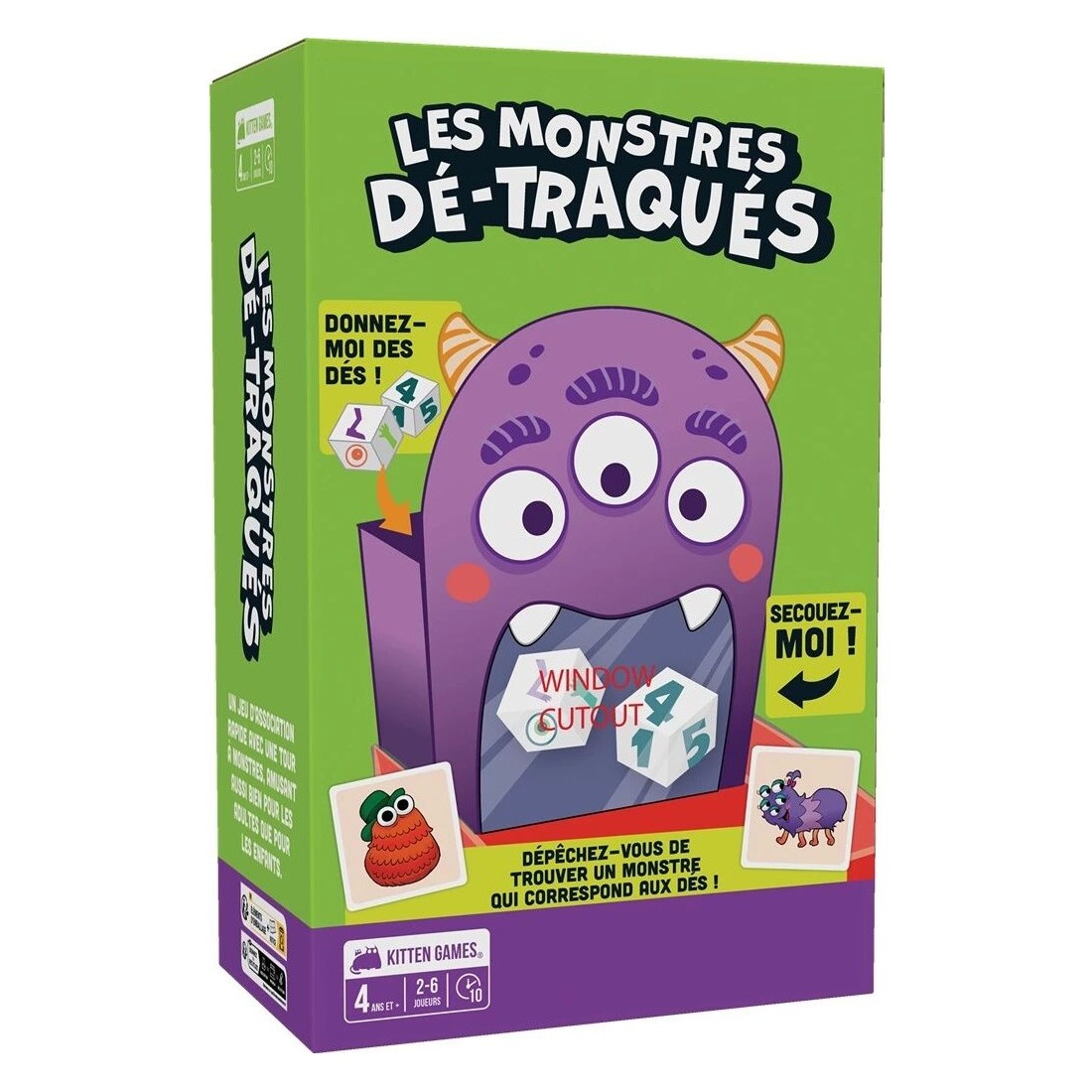Dans le jeu Les Monstres Dé-traqués, chaque partie est une course effrénée pour repérer le bon monstre avant les autres. À chaque tour, des cartes Monstre sont disposées face visible au centre de la table. Le joueur actif lance les deux dés via la Tour à Monstres : le premier indique un nombre (y compris zéro) et le second une caractéristique (bras, jambes ou yeux).