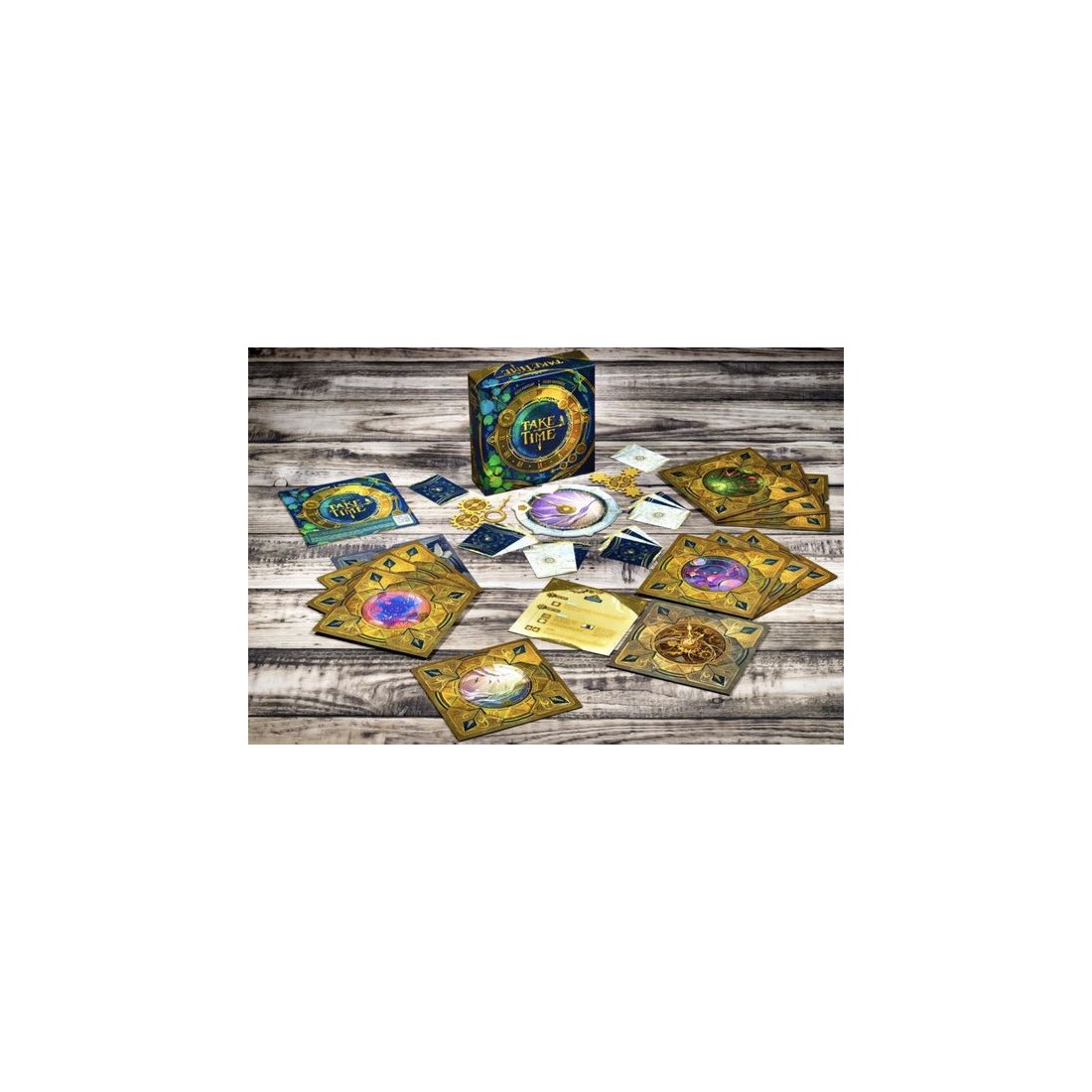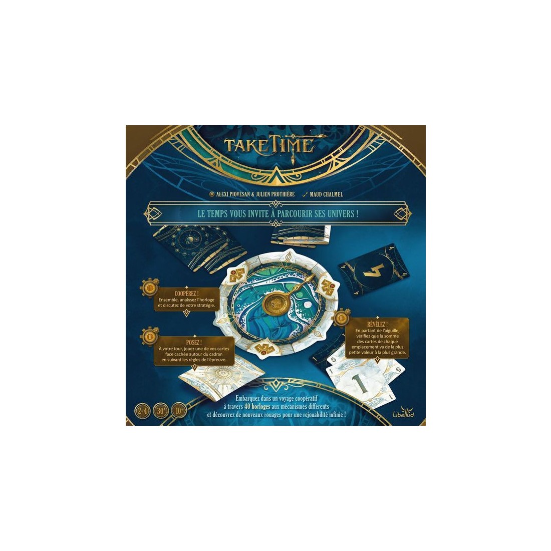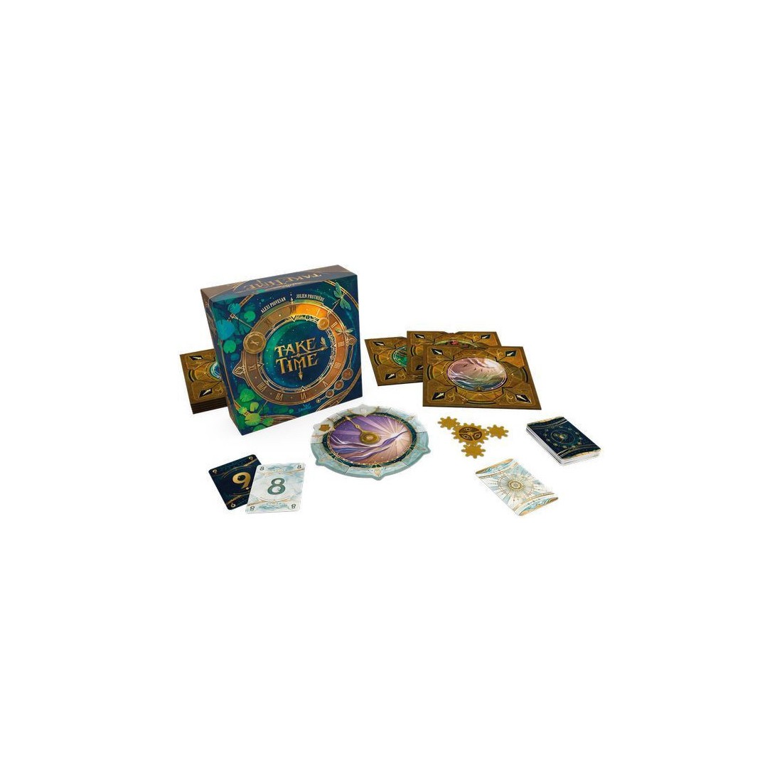 Prenez part à une aventure coopérative unique où chaque seconde compte. Dans Take Time, vous affrontez 40 horloges énigmatiques en équipe. Ouvrez l’une des enveloppes, retournez la première horloge, puis mélangez les 12 cartes Lune et les 12 cartes Soleil (numérotées de même manière) avant de les distribuer entre les joueurs.