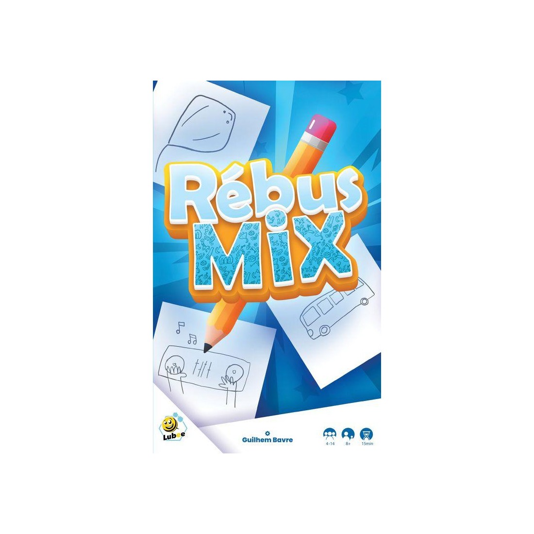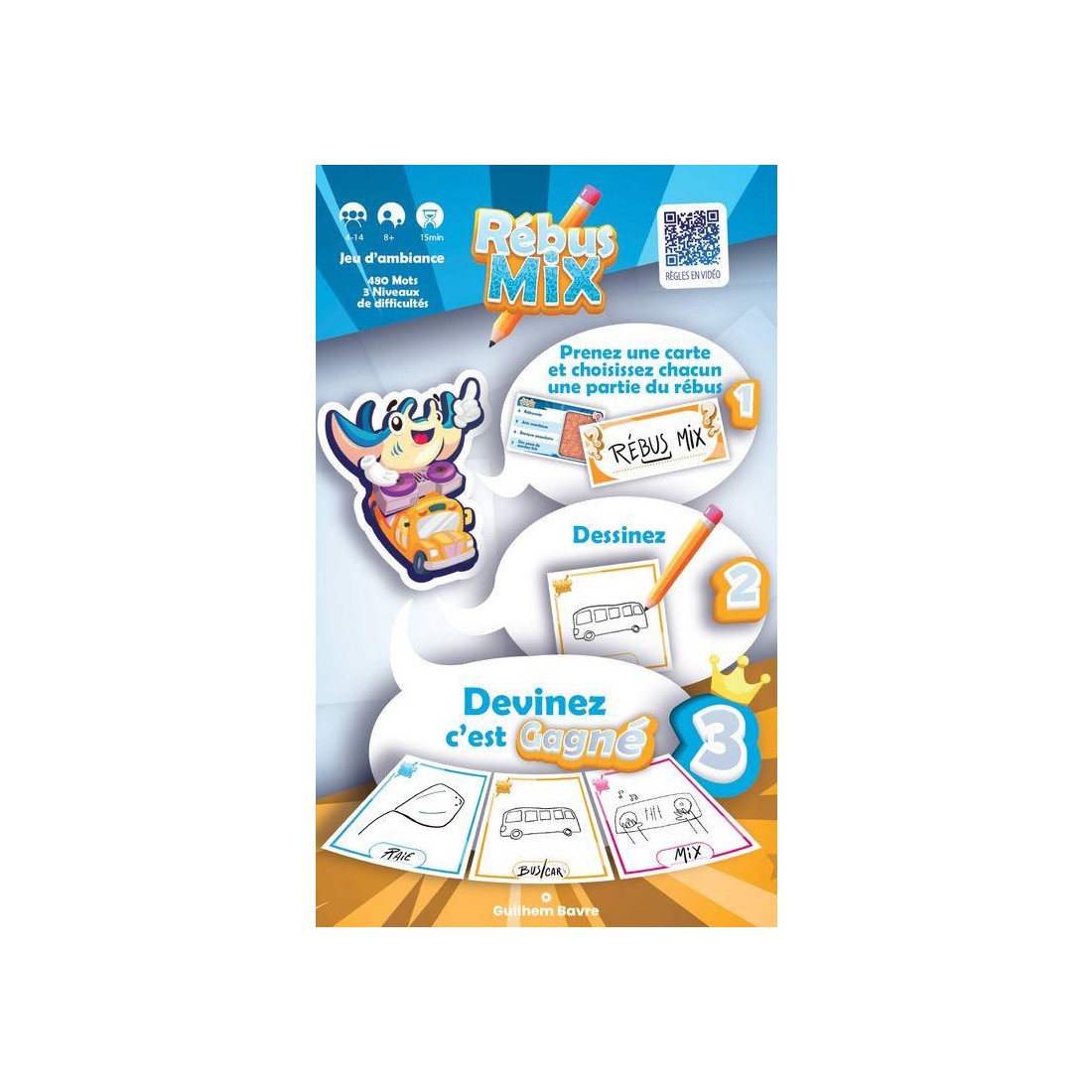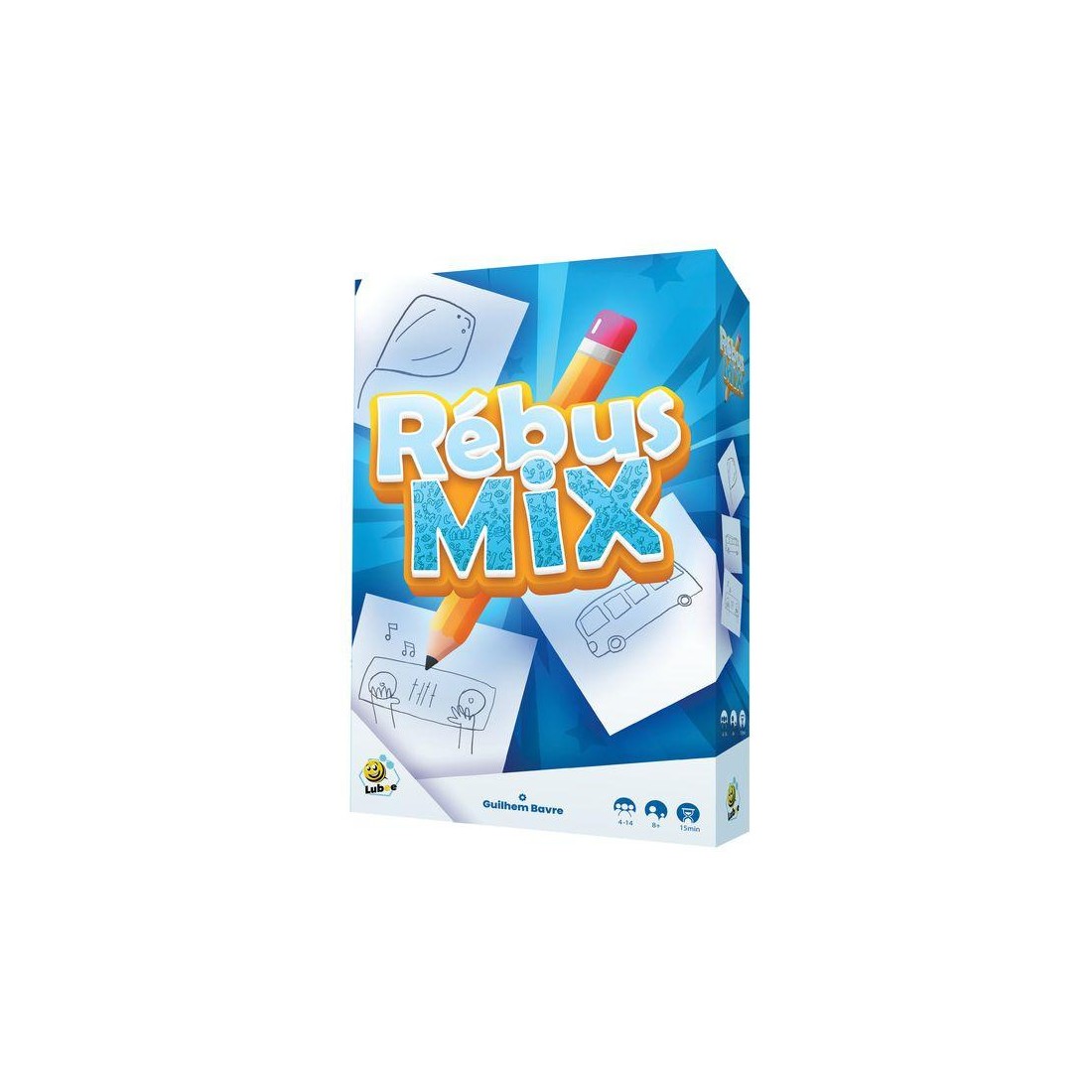 Dans "Rébus Mix", vous serez dessinateur et/ou Rébulogue à tour de rôle. Dans le temps imparti, vous allez devoir ensemble, dessiner et deviner le rébus. 3 degrés de difficultés dans les rébus, tant au niveau du dessin que de l'expression choisie. Vous avez 2 minutes pour dessiner votre partie du rébus, et que le Rébulogue ordonne les dessins et devine le mot (nom ou expression) de la carte.