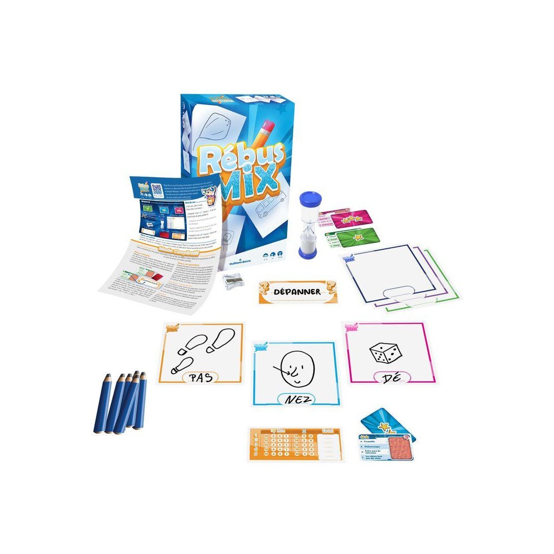 Rébus Mix est un jeu d'ambiance où les joueurs vont deviner des mots et expressions en réalisant des rébus de manière collective. A chaque tour, un joueur est désigné Rébulogue, il doit remettre dans l'ordre les dessins et deviner la signification du rébus réalisé par les autres joueurs.
