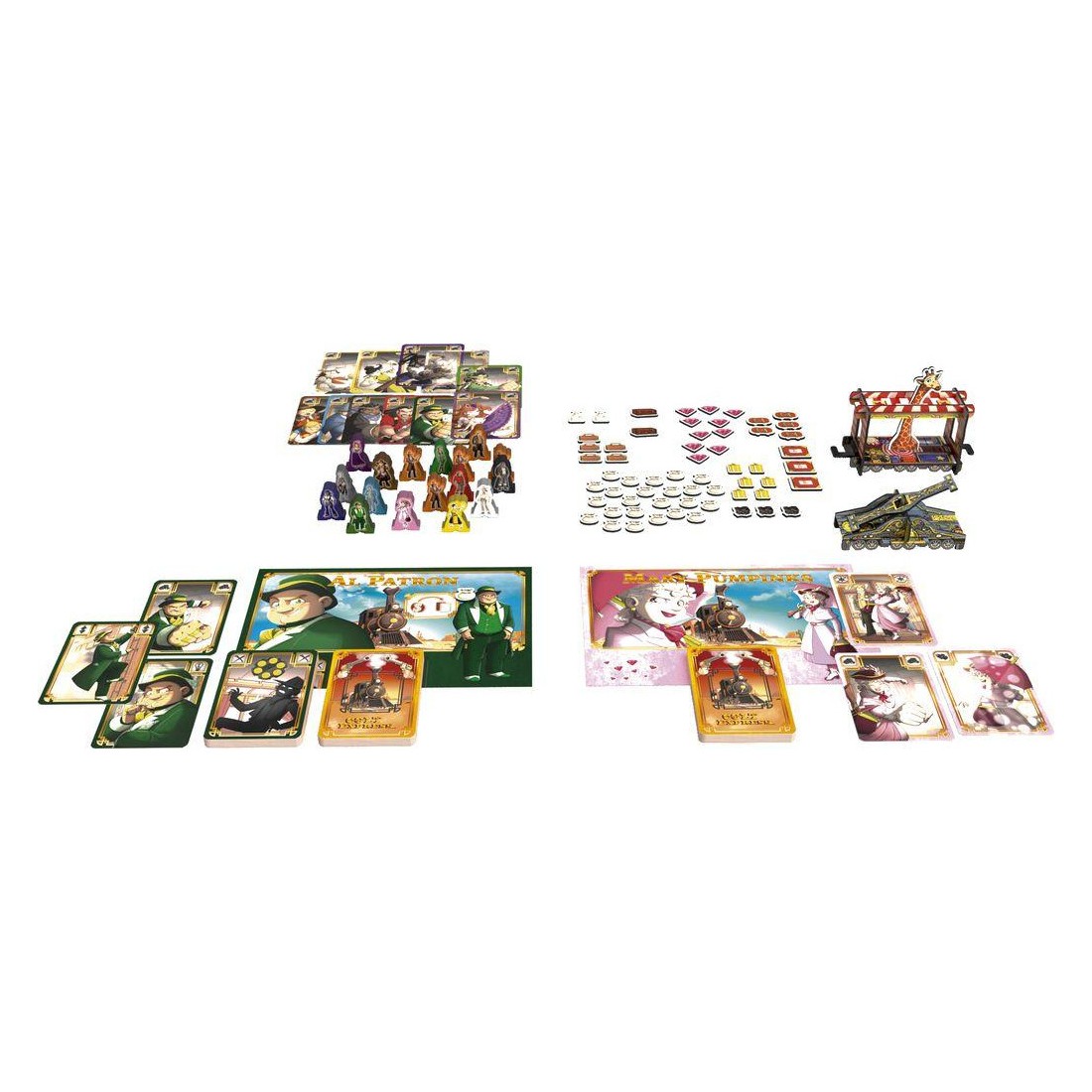 Contenu : - 11 cartes Coup de poing spécial, - 17 pions Personnage imprimés en bois, - 60 jetons Butin imprimés en bois, - Wagon Circus, - Wagon Pompe, , - Al Patron, 1 fiche Personnage, 1 carte Personnage, 10 cartes Action de base, 1 carte Idée Géniale, 1 carte Prisonnier, 1 carte Coup de pouce, 1 carte Wanted, 1 carte Objectif du Marshal, 1 carte Chevauchée, 6 cartes Balle, - Mary Pumpinks, 2 cartes Tir, 1 carte Coup de Chapeau, 1 carte Séduction, 1 carte Coup de poing, 2 cartes Braquage, 2 cartes Déplacement