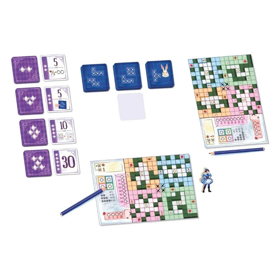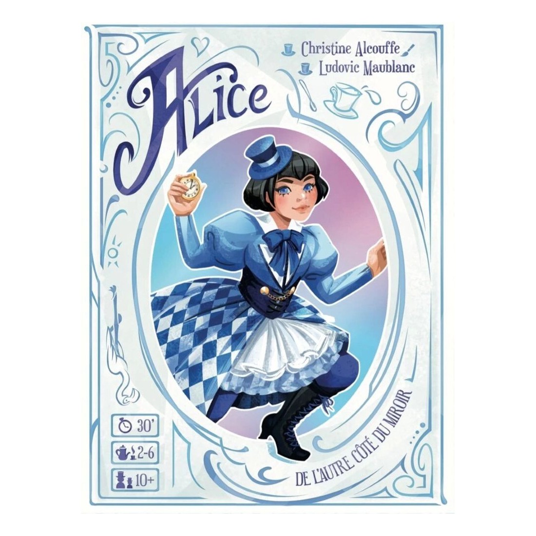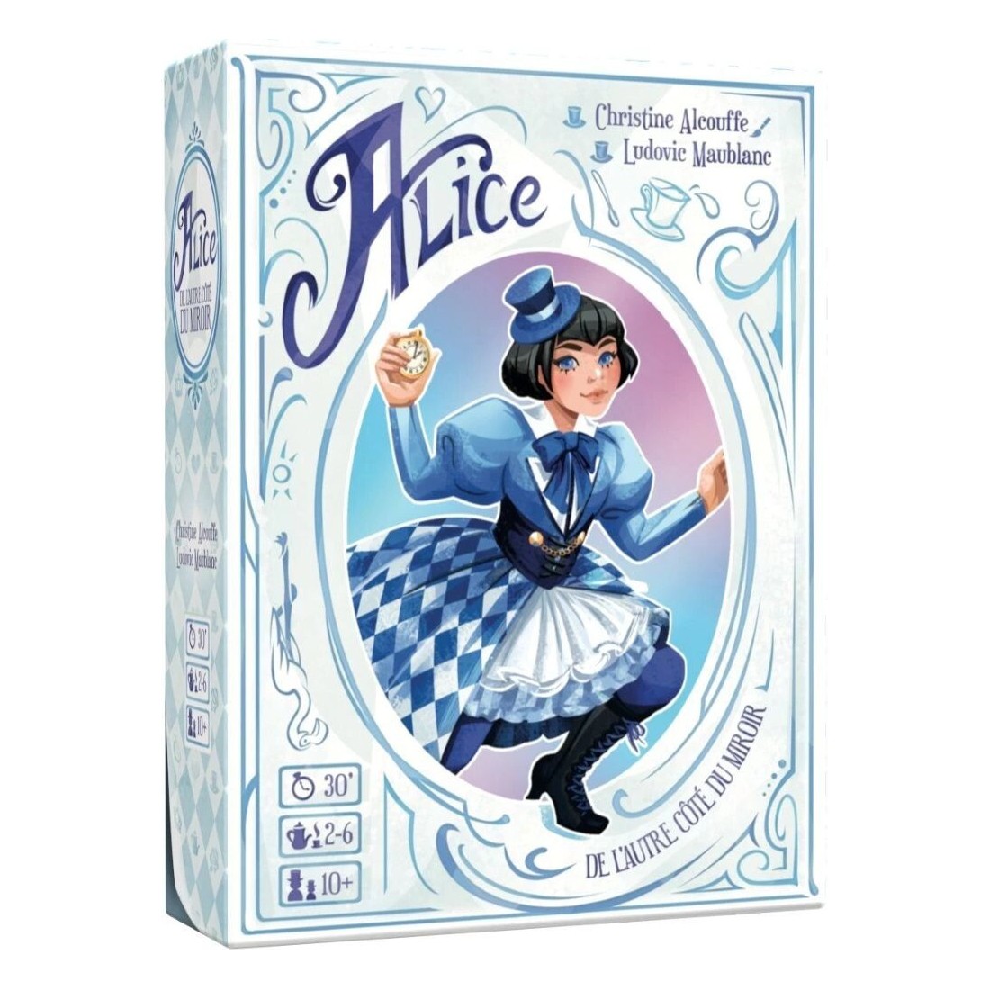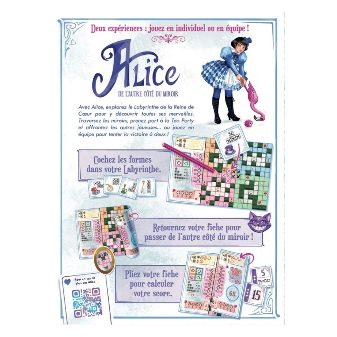 Alice est un jeu à cocher compétitif où chaque joueur doit reproduire sur sa fiche les formes révélées au centre de la table. À chaque tour, une carte Forme est retournée : tous les joueurs tracent la forme sur leur fiche en respectant des règles de placement simples mais tactiques. Certaines cases déclenchent des bonus : agrandir ou réduire une forme, marquer des points ou activer des effets. Le twist : la fiche est recto-verso, et on la retourne en cours de partie en traversant un miroir ! Un système de zones colorées et d’icônes à optimiser enrichit les choix. Un mode équipe complète l’expérience pour des parties en duo avec des objectifs asymétriques. Le scoring croisé et les multiples interactions entre les éléments rendent chaque partie vivante, fluide et maline.