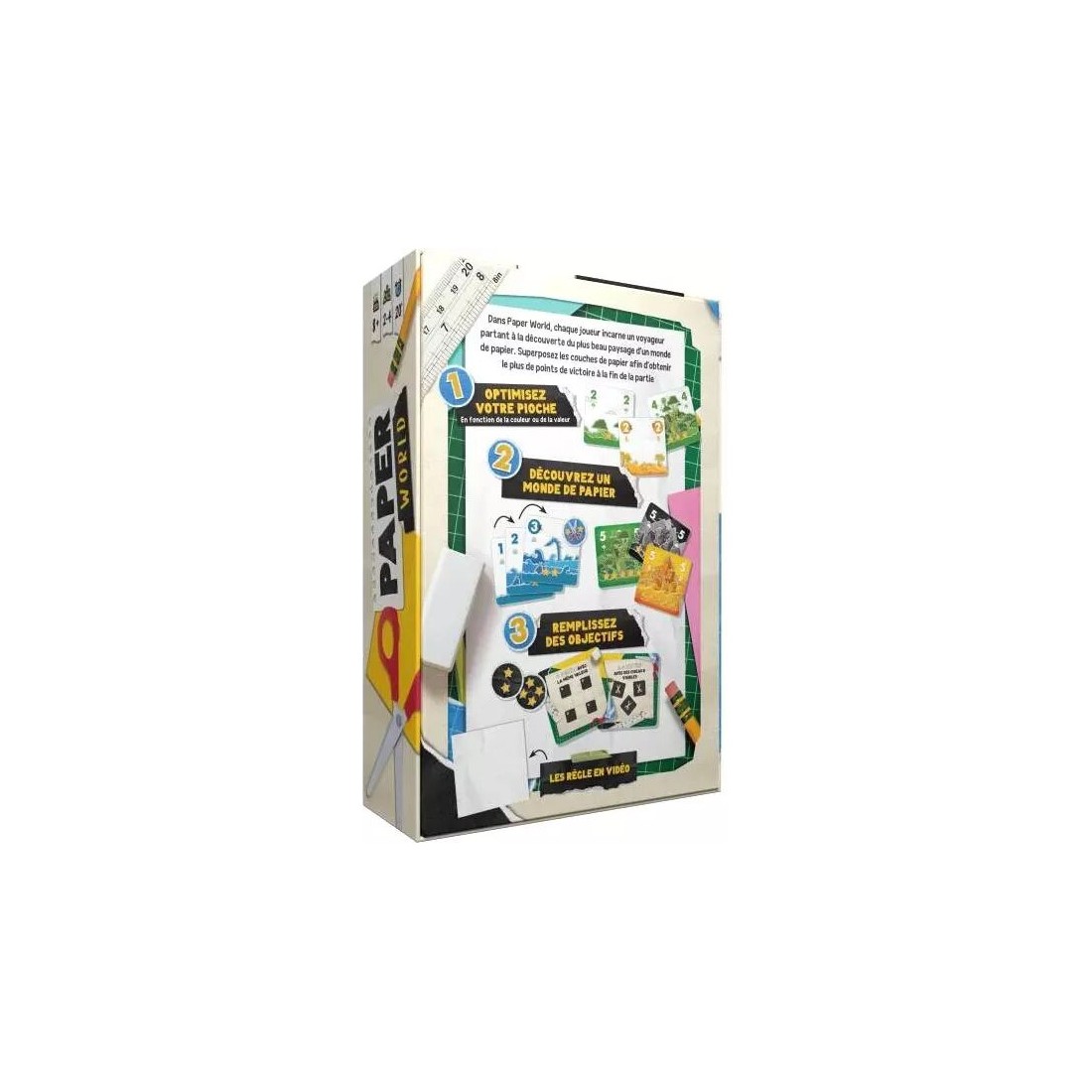 Dans le jeu Paper World, chaque joueur incarne un voyageur qui tente de recréer les paysages qu'il a vus au cours de ses voyages à l'aide de couches de papier. Empilez les différentes couches de papier que vous trouvez pour avoir le plus de points de victoire à la fin de la partie.