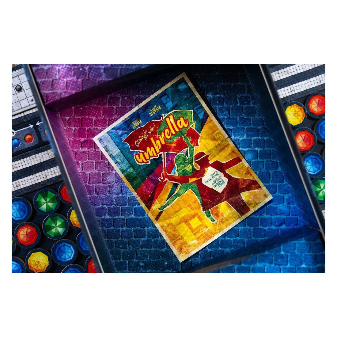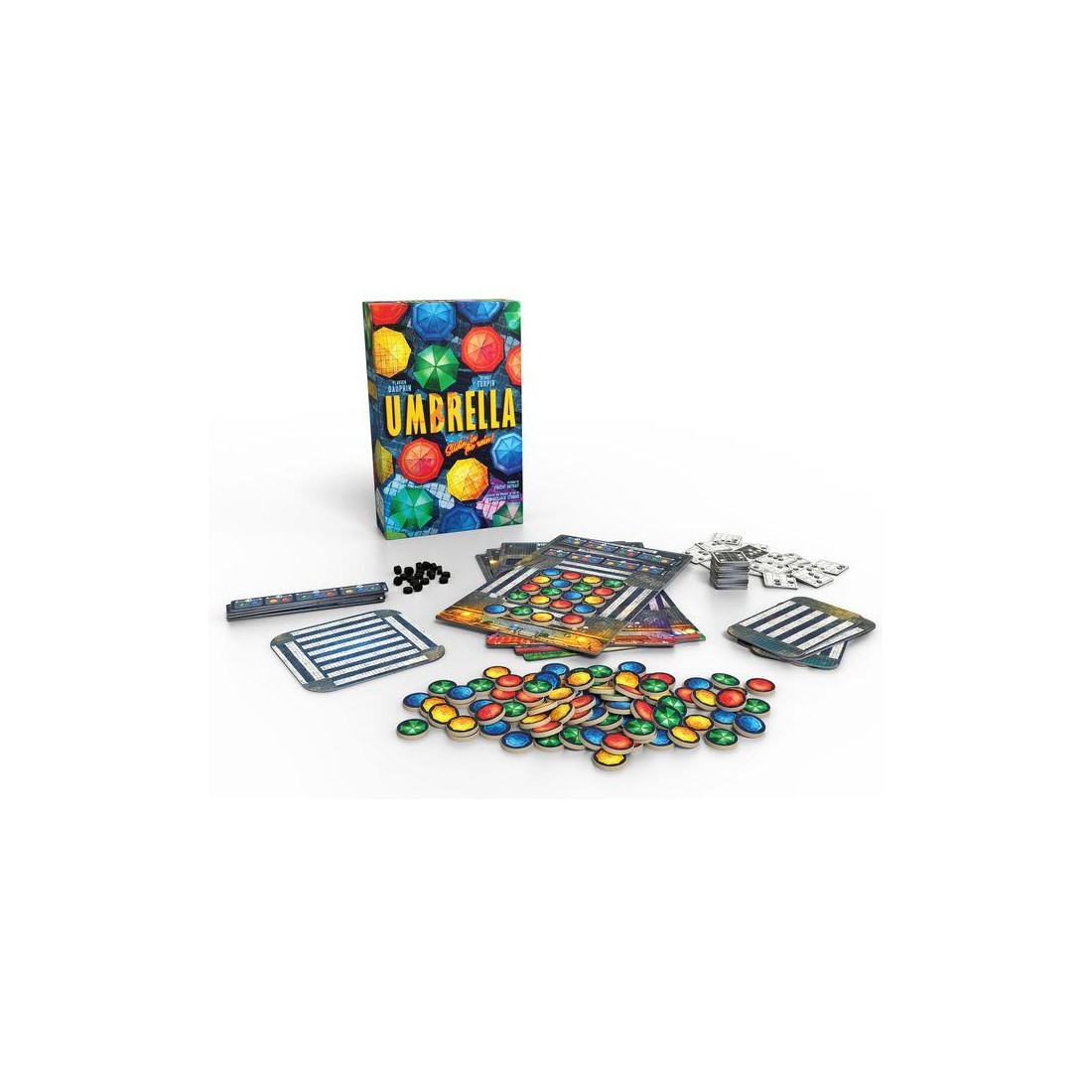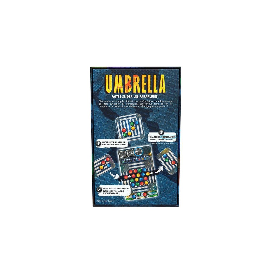 Contenu : 4 Plateaux Personnels "Scène", 5 Zones d'attentes, 24 Tuiles Chorégraphie, 28 Jetons de score en bois, 8 Plaquettes de core recto/verso, 100 Jetons Parapluie en bois,