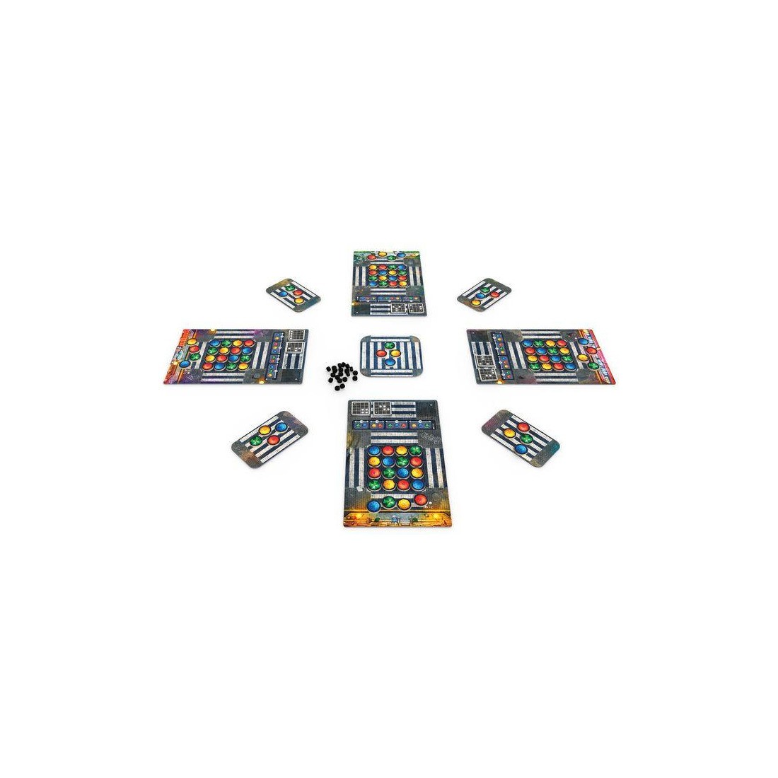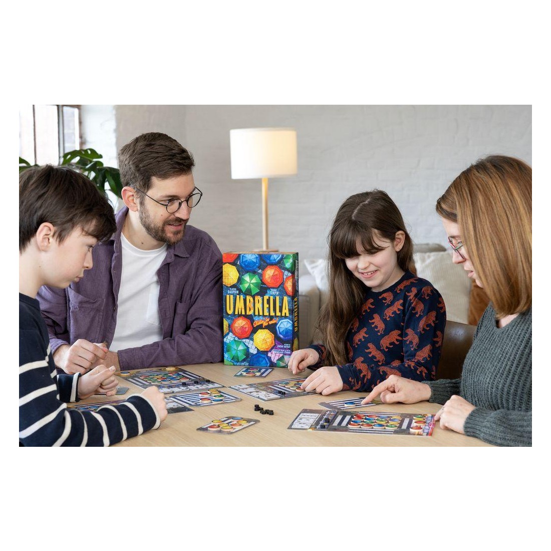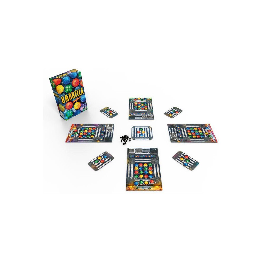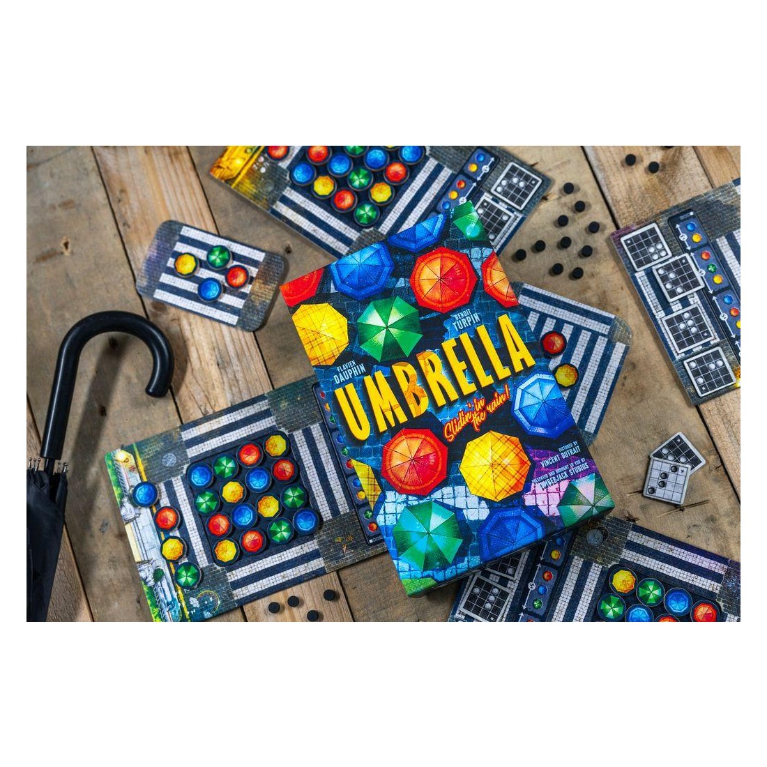 Contenu : 4 Plateaux Personnels "Scène", 5 Zones d'attentes, 24 Tuiles Chorégraphie, 28 Jetons de score en bois, 8 Plaquettes de core recto/verso, 100 Jetons Parapluie en bois,