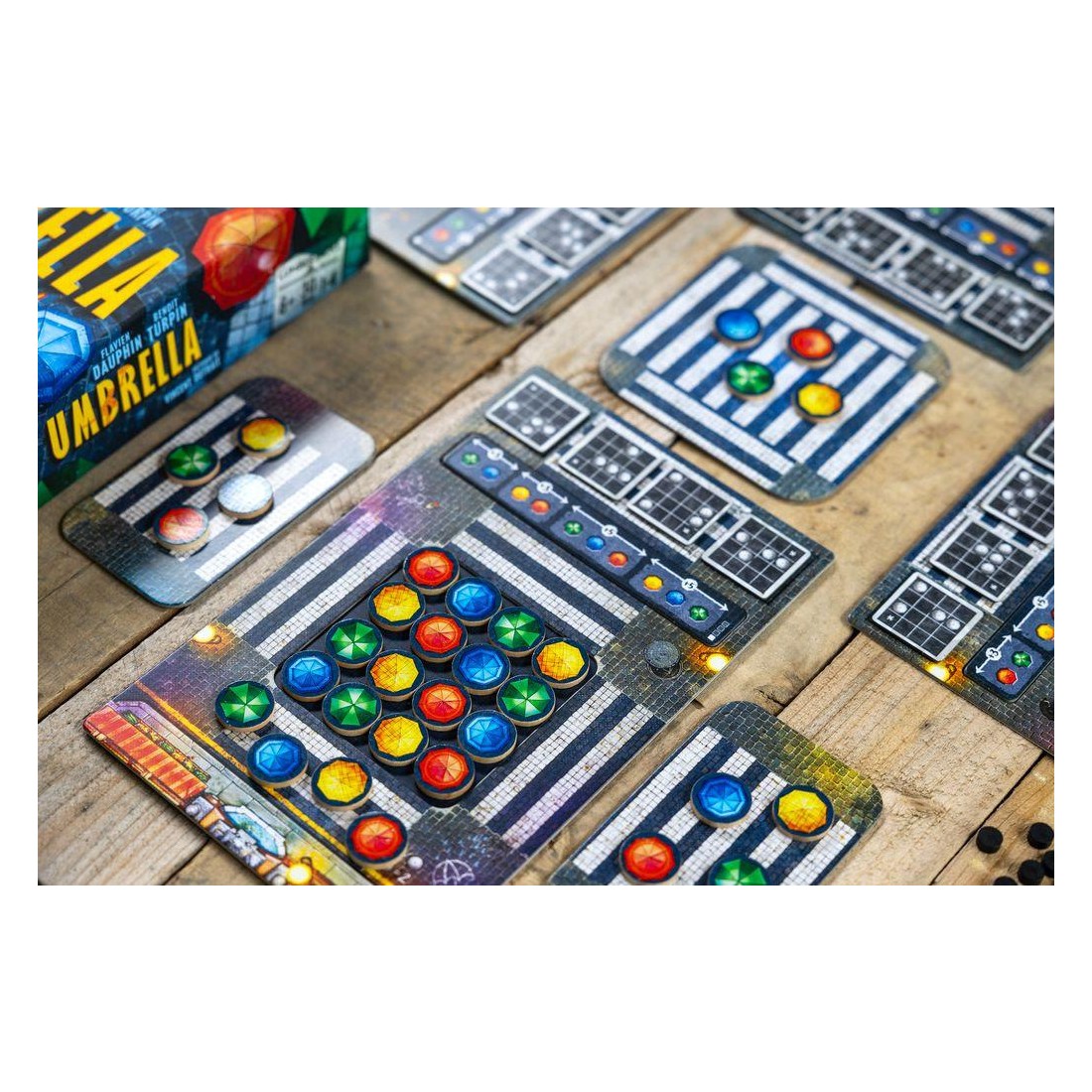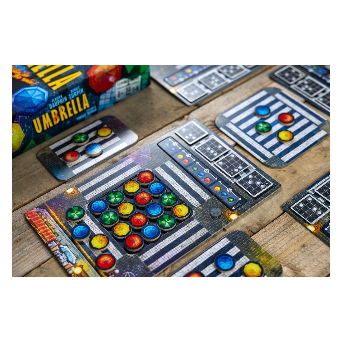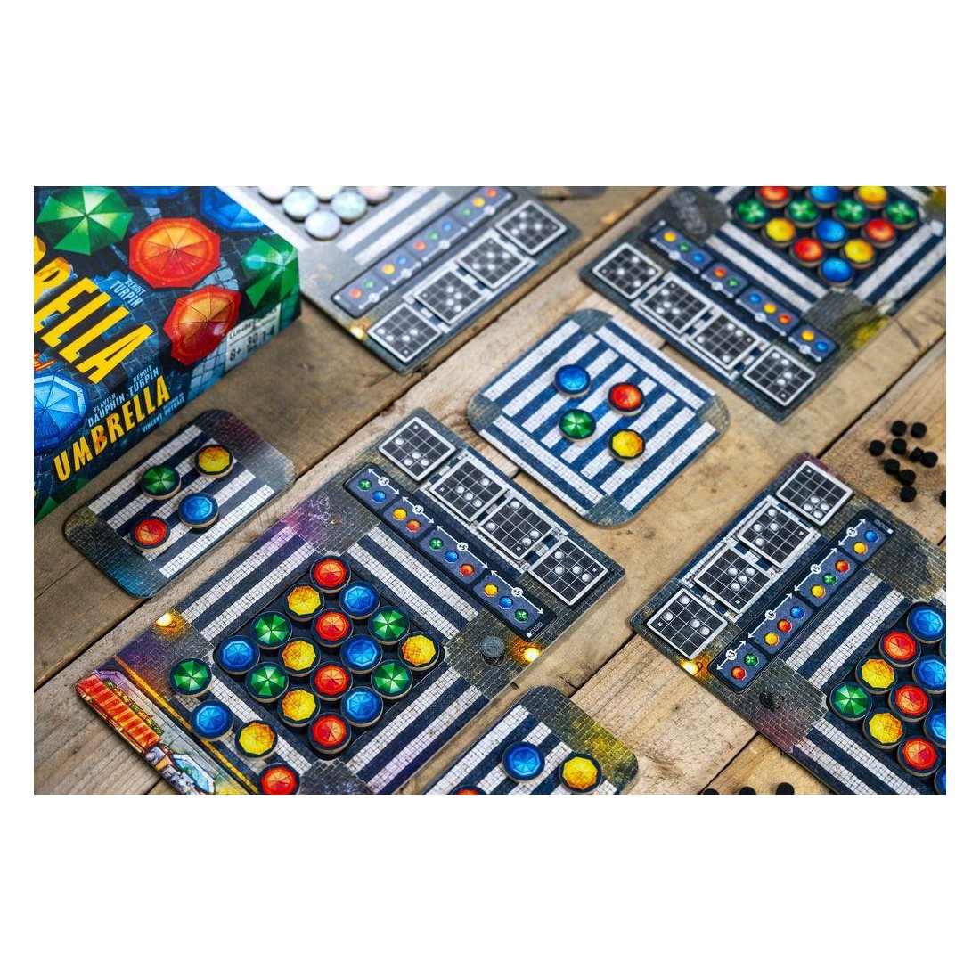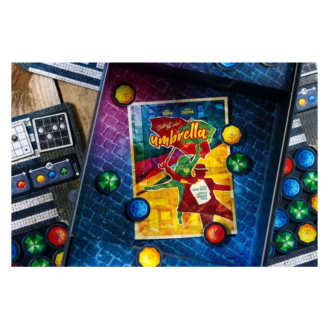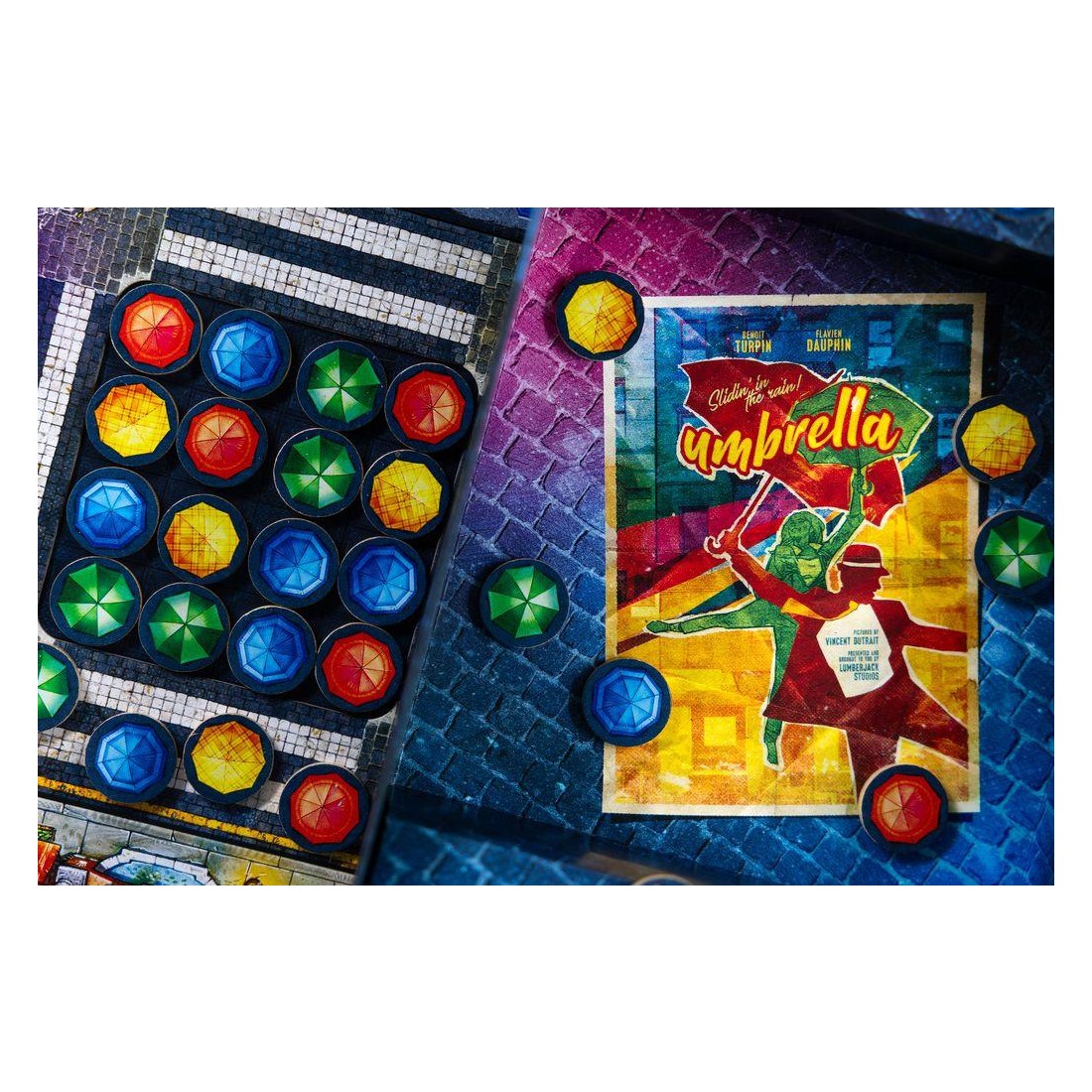 Avec cette mécanique simple, vous devrez réaliser des "combinaisons" que nous appelons "chorégraphies", sur votre plateau afin d'obtenir un jeton score que vous placerez sur notre plaquette de score. En fonction des couleurs de parapluies que vous aurez choisi pour réaliser les chorégraphies, vous pourrez optimiser votre score et marquer plus de point.
