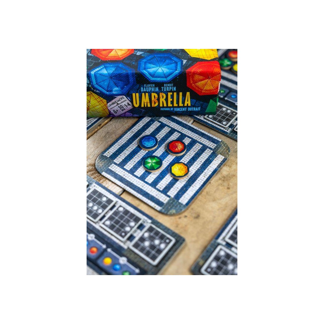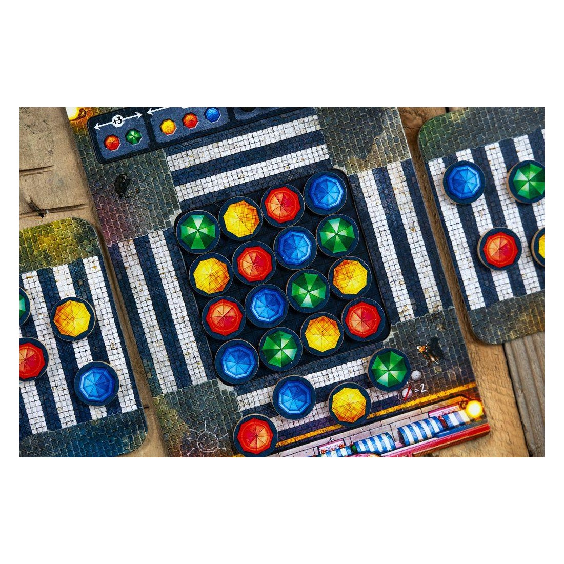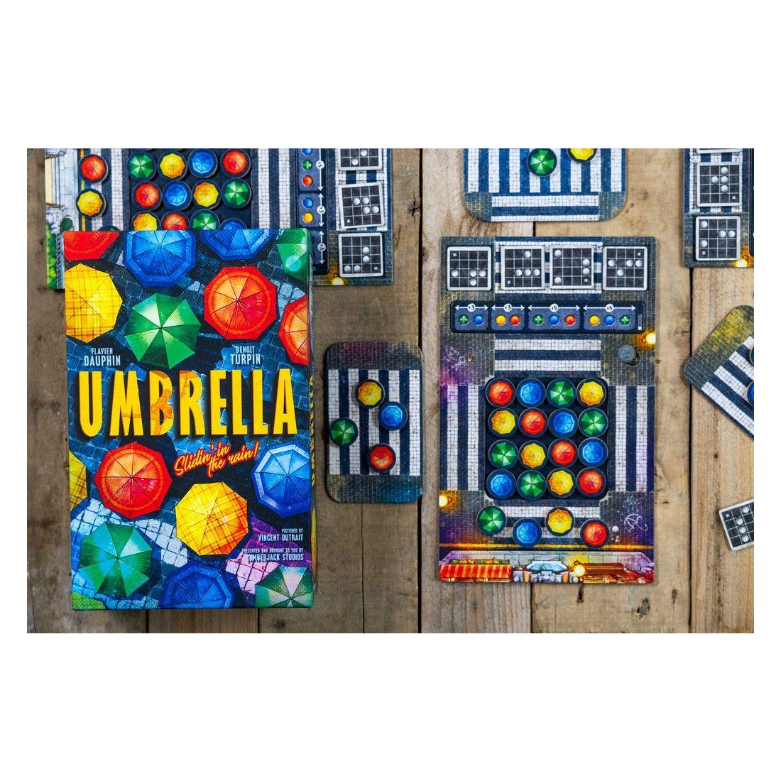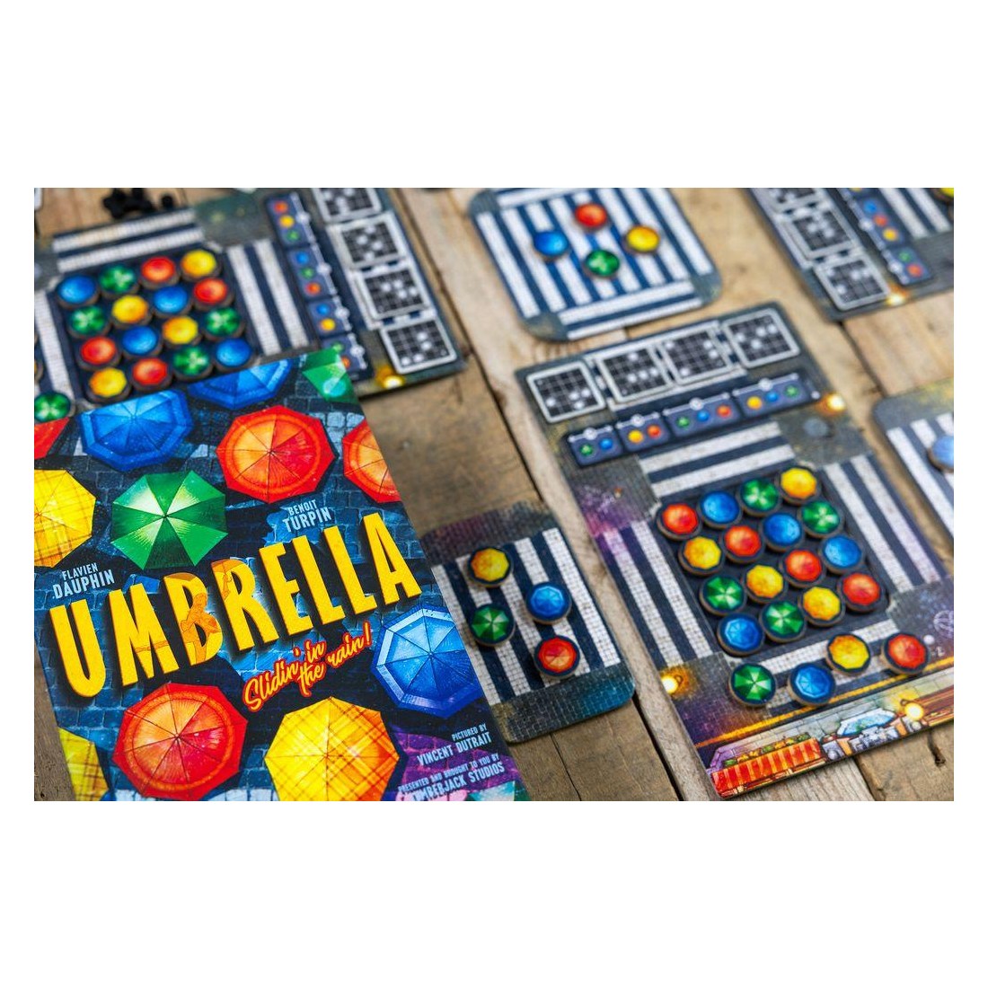 Avec cette mécanique simple, vous devrez réaliser des "combinaisons" que nous appelons "chorégraphies", sur votre plateau afin d'obtenir un jeton score que vous placerez sur notre plaquette de score. En fonction des couleurs de parapluies que vous aurez choisi pour réaliser les chorégraphies, vous pourrez optimiser votre score et marquer plus de point.