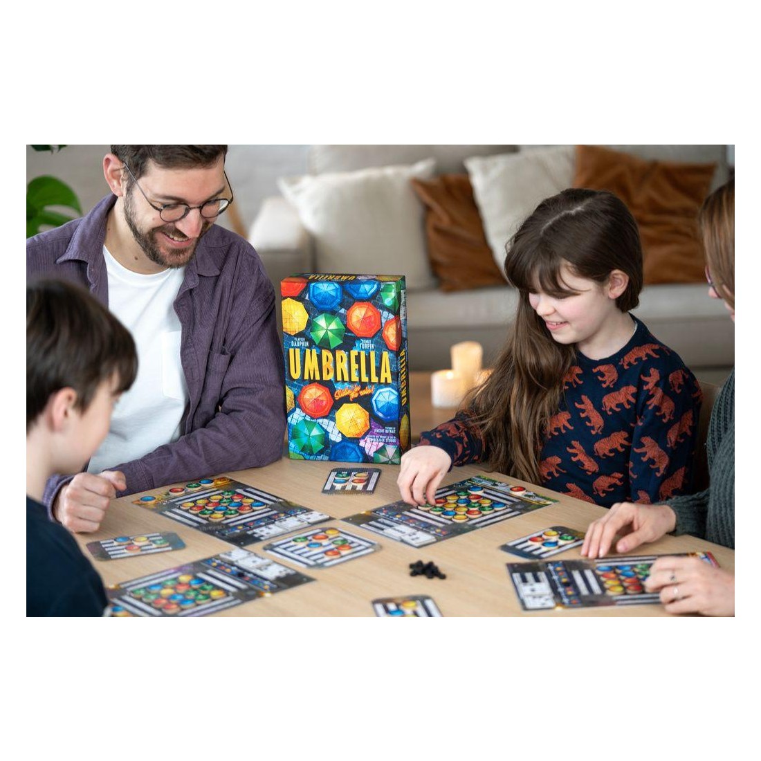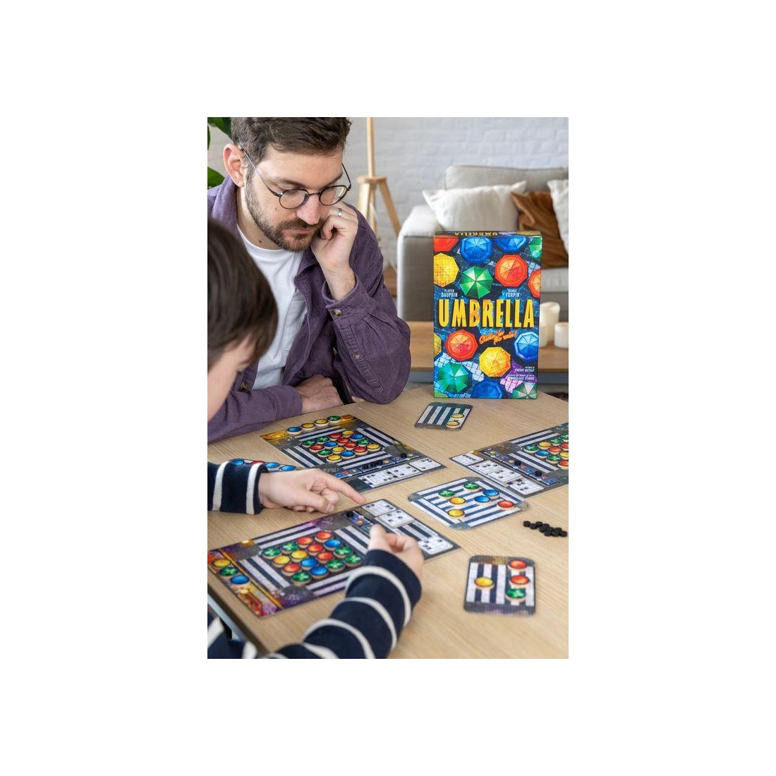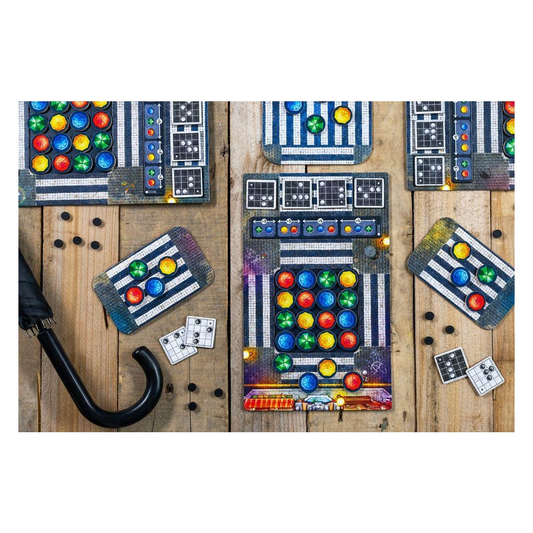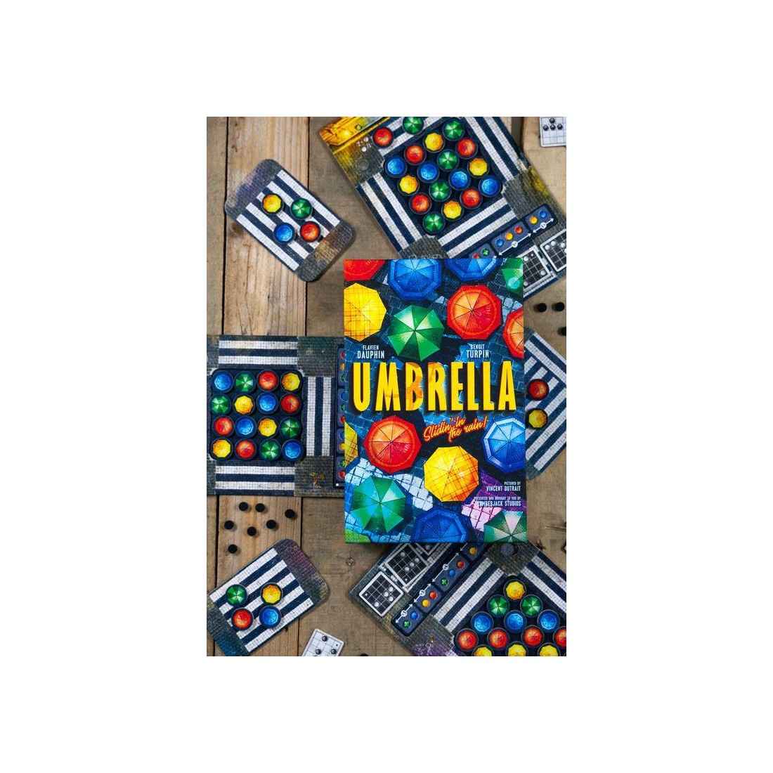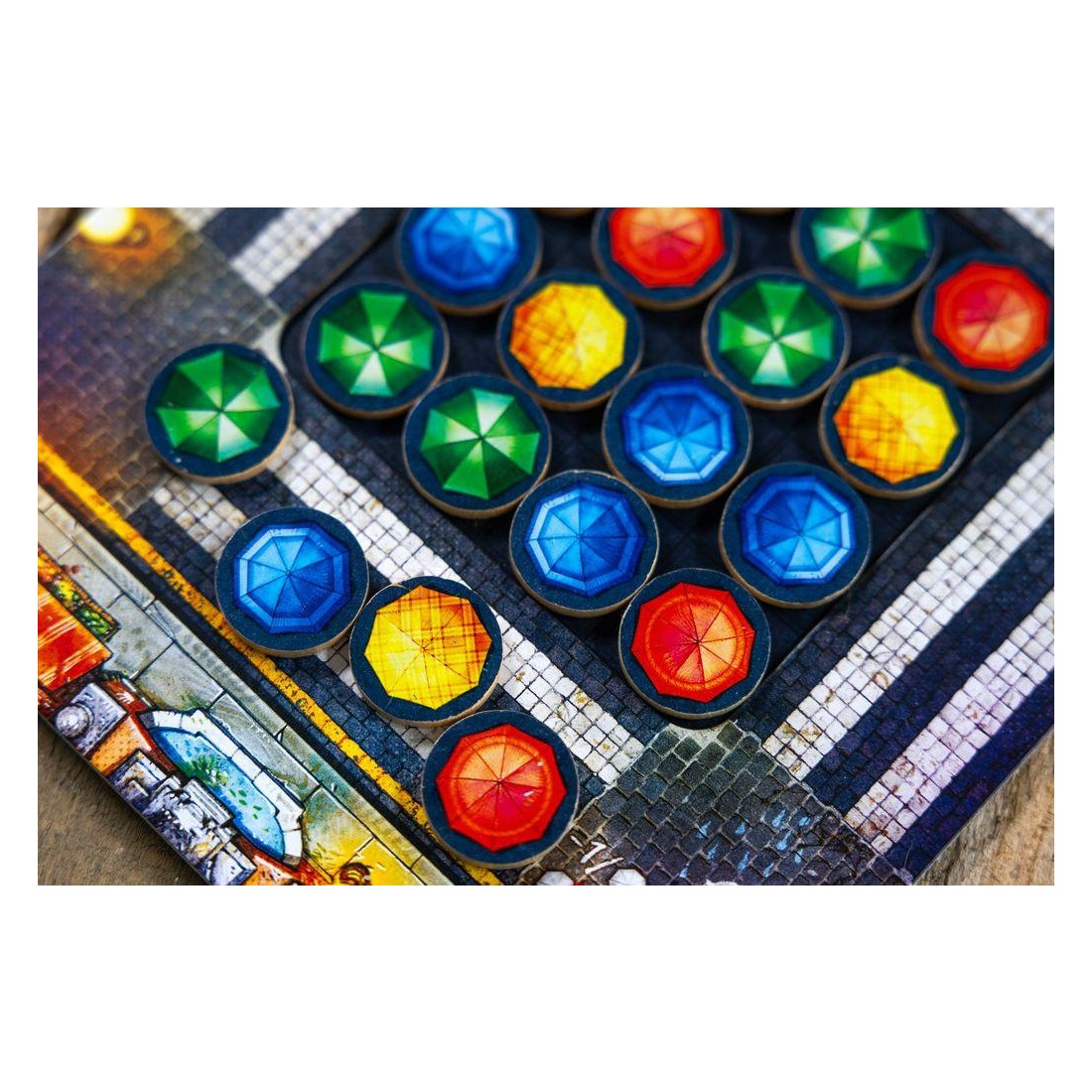Avec cette mécanique simple, vous devrez réaliser des "combinaisons" que nous appelons "chorégraphies", sur votre plateau afin d'obtenir un jeton score que vous placerez sur notre plaquette de score. En fonction des couleurs de parapluies que vous aurez choisi pour réaliser les chorégraphies, vous pourrez optimiser votre score et marquer plus de point.