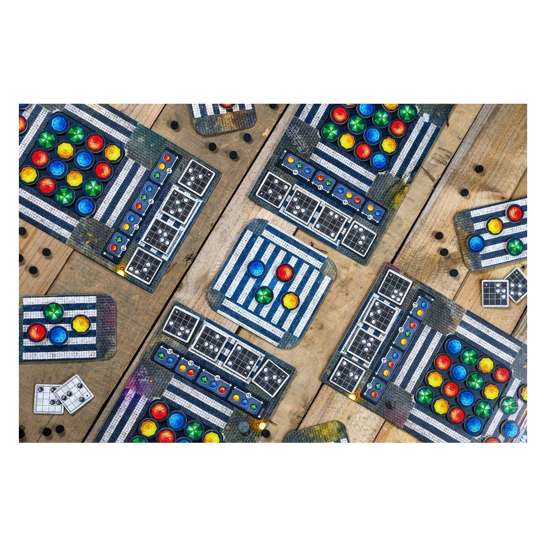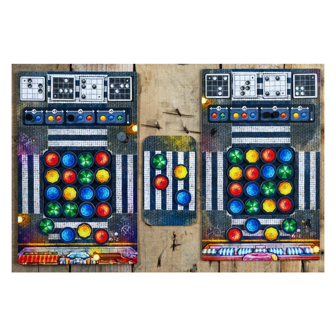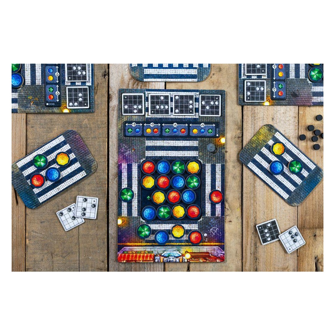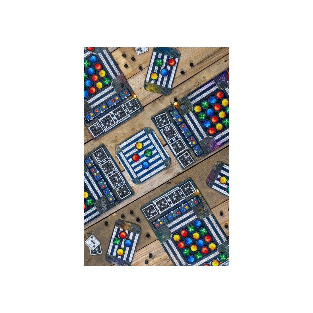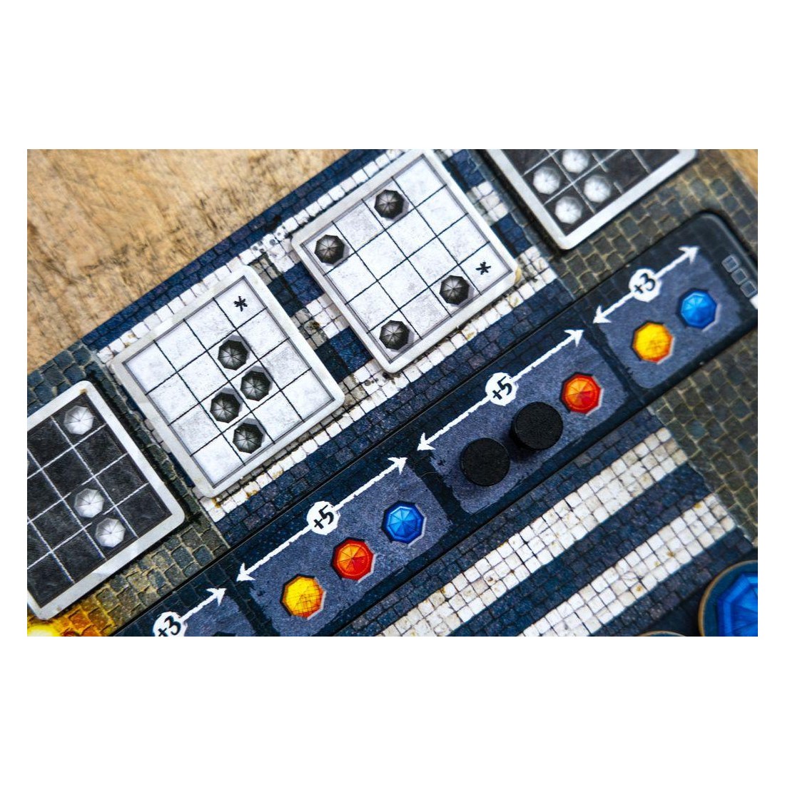 Avec cette mécanique simple, vous devrez réaliser des "combinaisons" que nous appelons "chorégraphies", sur votre plateau afin d'obtenir un jeton score que vous placerez sur notre plaquette de score. En fonction des couleurs de parapluies que vous aurez choisi pour réaliser les chorégraphies, vous pourrez optimiser votre score et marquer plus de point.