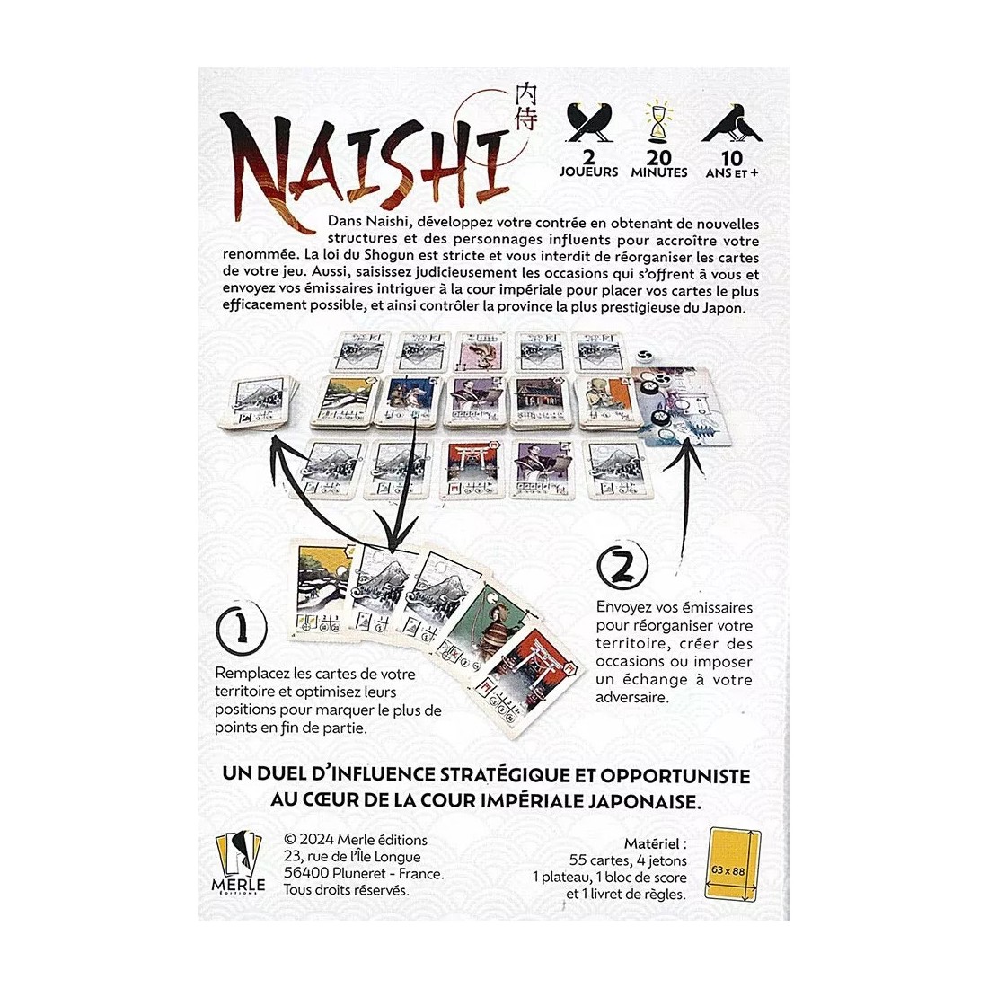 Dans le jeu Naishi, plongez dans le Japon médiéval et prenez la tête d'une province. Développez votre contrée en obtenant de nouvelles structures et des personnages influents pour accroître votre renommée. La loi du Shogun est stricte et vous interdit de réorganiser les cartes de votre jeu. Aussi, saisissez judicieusement les occasions qui s’offrent à vous et envoyez vos émissaires intriguer à la cour impériale pour placer vos cartes le plus efficacement possible et ainsi contrôler le territoire le plus prestigieux du Japon.