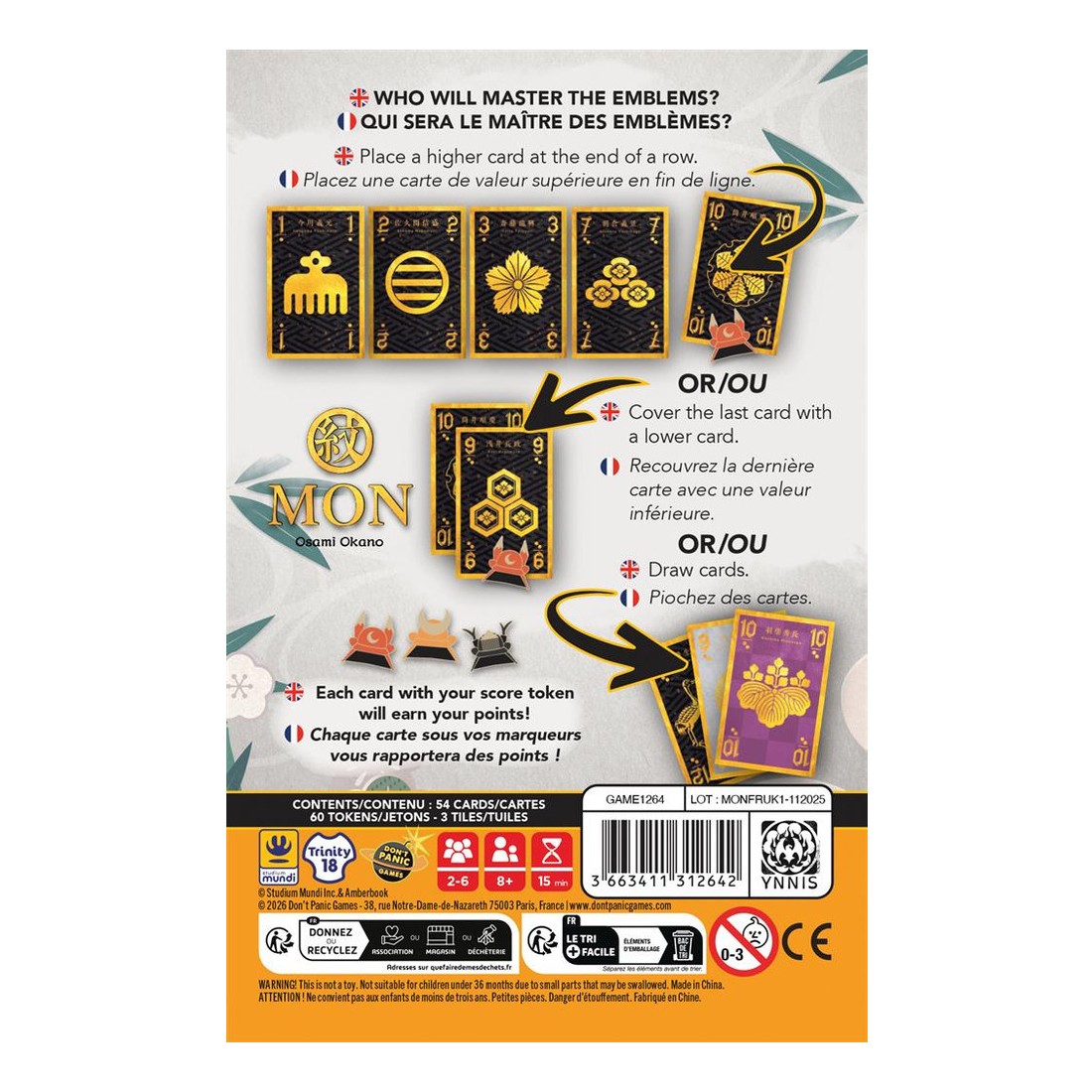Les joueurs doivent donc évaluer en permanence quand intervenir, quand renforcer une ligne ou quand retourner une situation en leur faveur. Grâce à ses règles accessibles et ses parties rapides, Mon propose une expérience pleine de subtilités. C'est un jeu à l'interaction forte, où les retournements de situations seront fréquents car une simple carte peut changer l’équilibre d’une rangée.