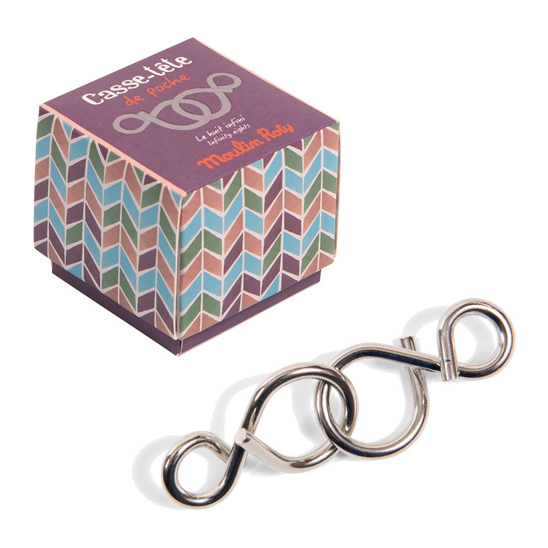 Deux pièces métal sous le signe de l'infini, à attacher et détacher… Défis tes neurones et amuse-toi ! Solution fournie dans la boîte.