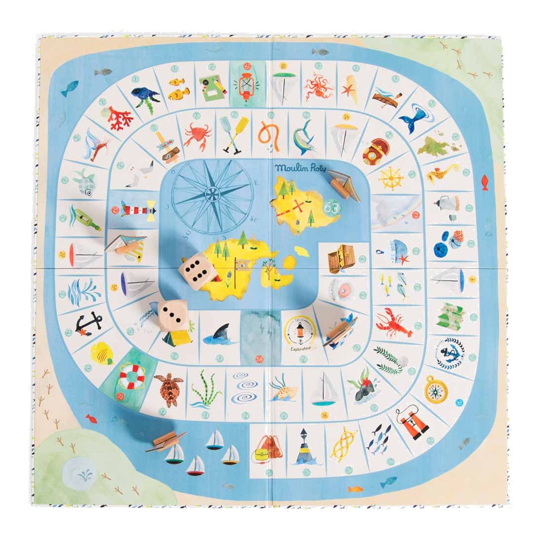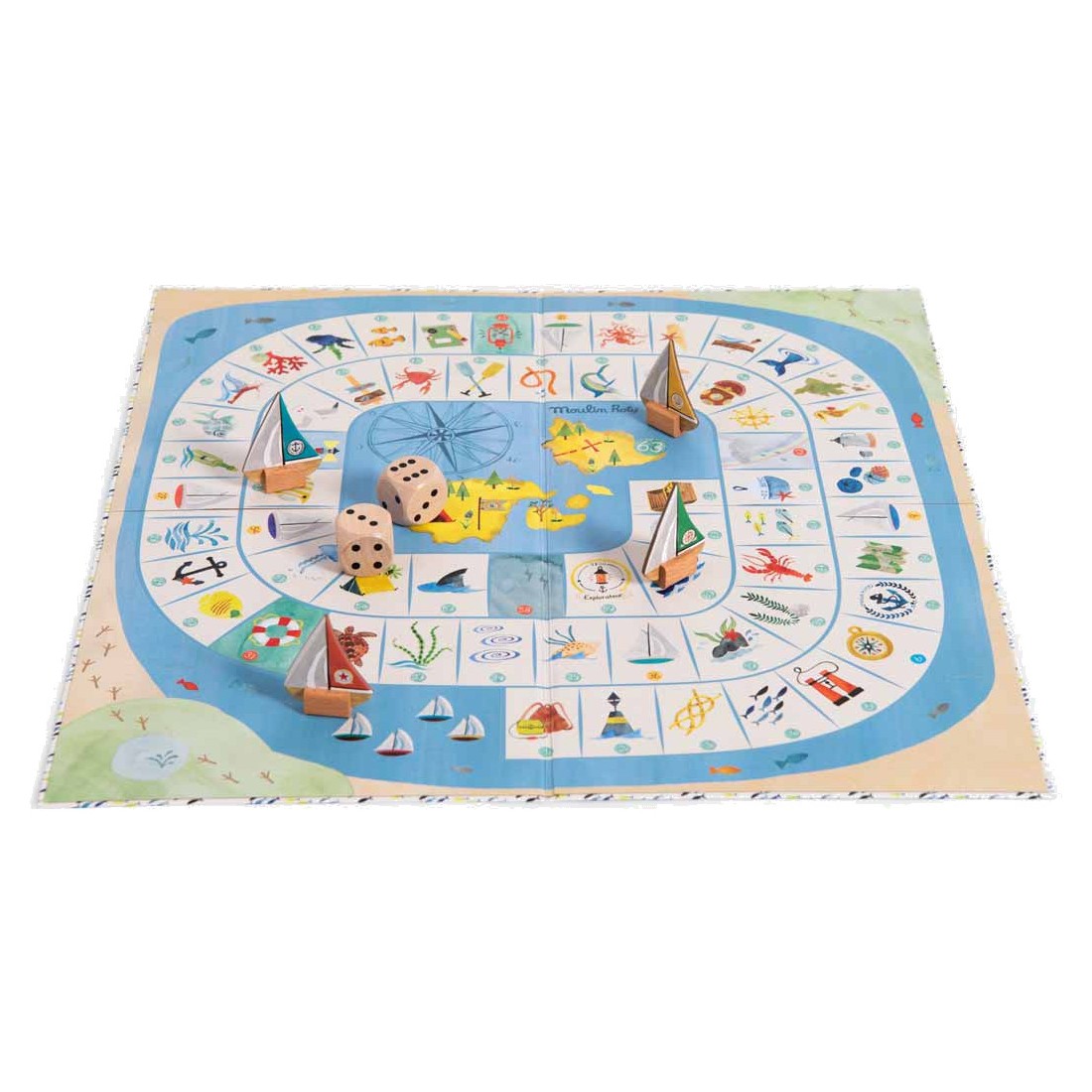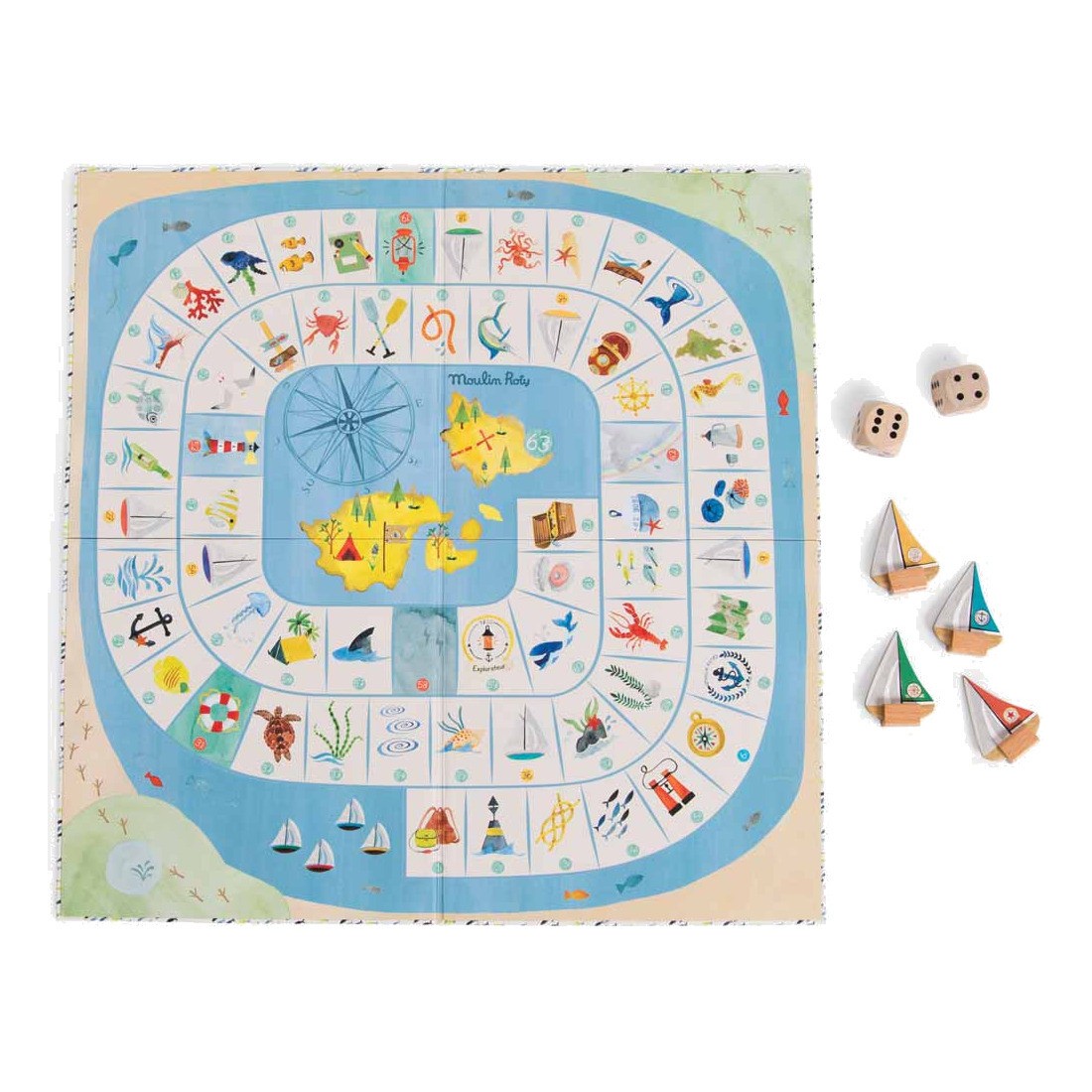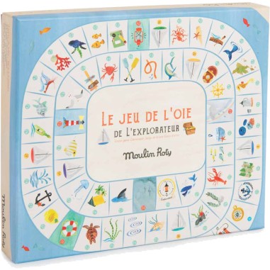 Un jeu de l'oie spécial explorateur où l'on croise de drôles de poissons et de dangereux tourbillons… Hissez les voiles, le premier arrivé sur l'île gagne le trésor ! Comprend 4 pions bateaux, 2 grands dés et un plateau illustré à l'aquarelle.