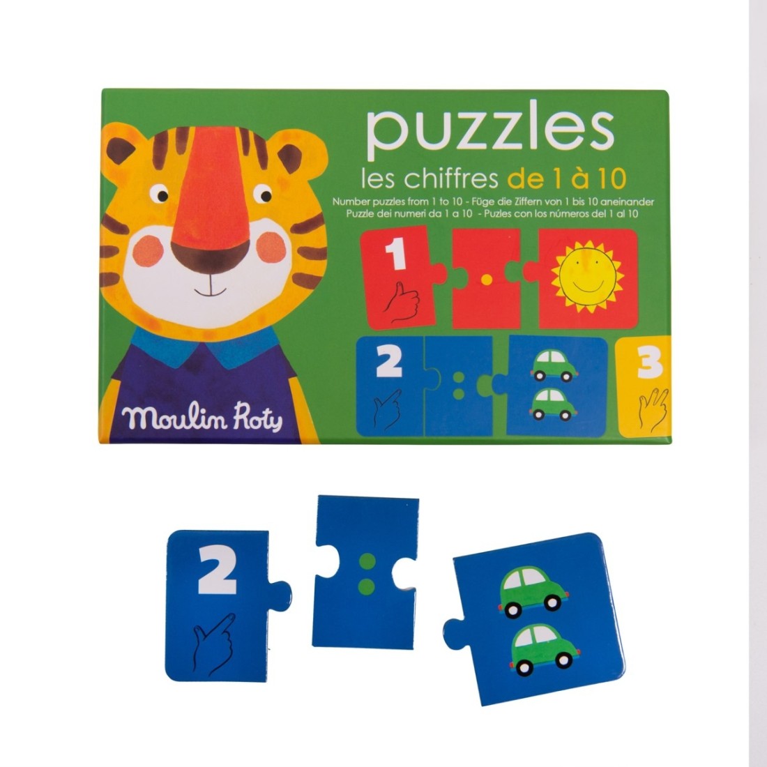 Un ensemble de 10 puzzles pour apprendre les chiffres de 1 à 10 en s'amusant ! A chaque fois, le chiffre, des points et un dessin à associer pour reconstituer un puzzle de 3 pièces.