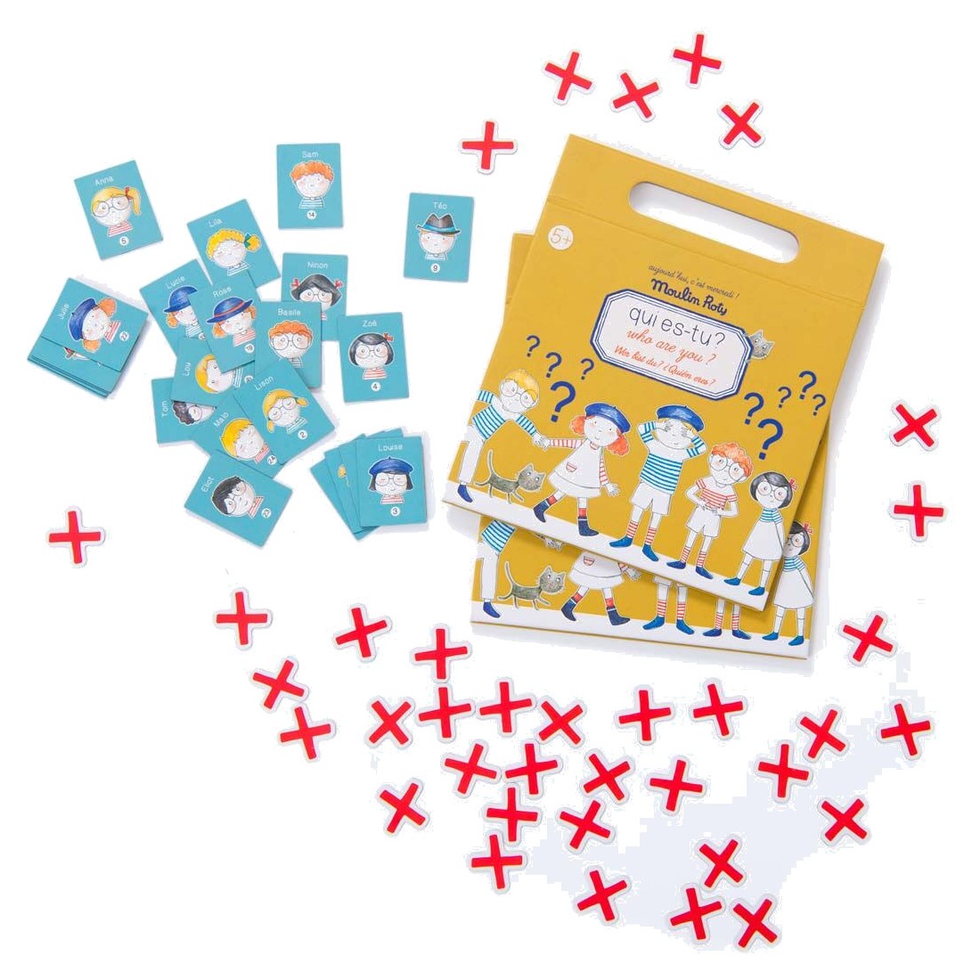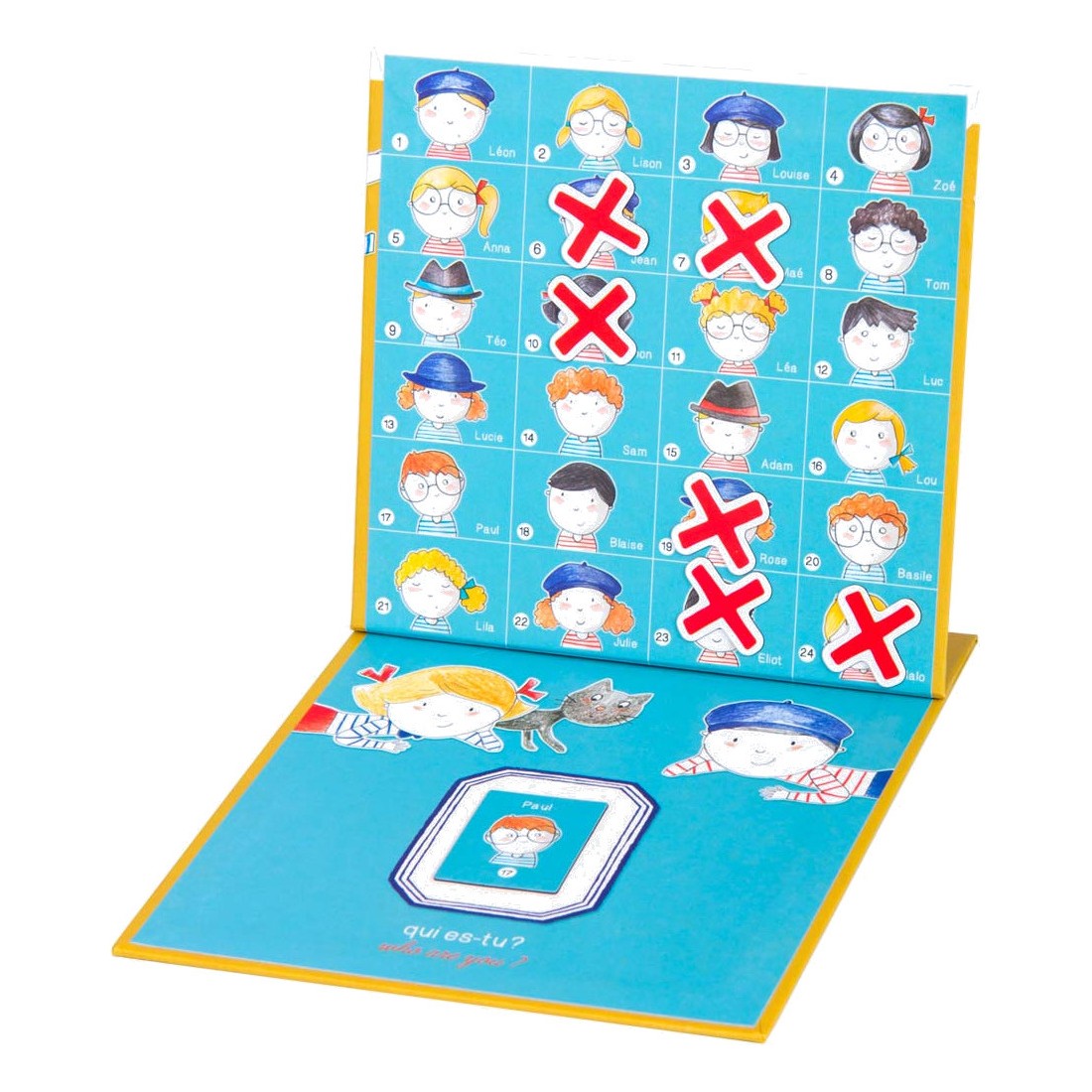 Qui es-tu ? Avec les magnets et les deux planches magnétiques illustrant plusieurs personnages, devine celui de ton partenaire en lui posant des questions sur son identité !