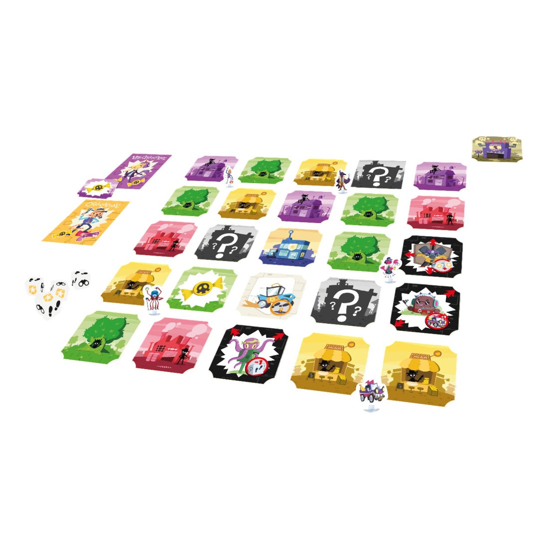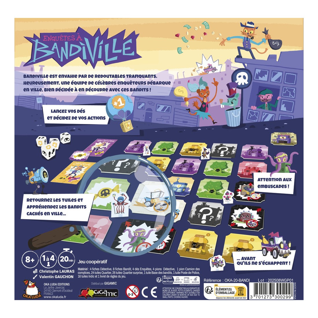 Bienvenue à Bandiville, une cité en proie à une vague de trafics orchestrée par une bande de redoutables bandits ! Aux côtés de Tarentule Poirot, Corbolumbo et leurs acolytes, menez l’enquête, fouillez les quartiers et coopérez pour les arrêter avant que le camion des complices ne boucle son tour de la ville. À chaque tour, lancez vos dés pour choisir vos actions : déplacements, espionnage ou arrestations.