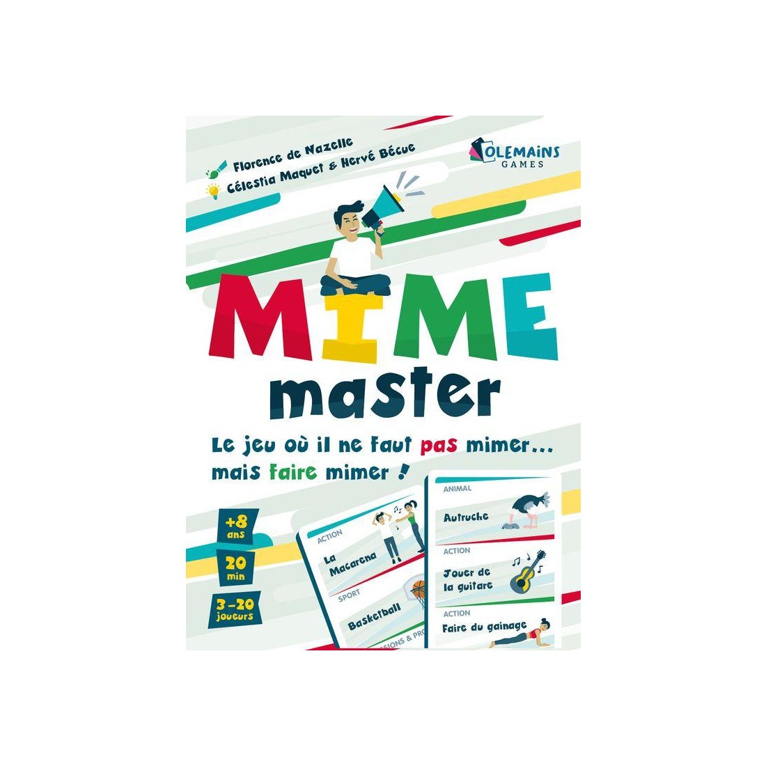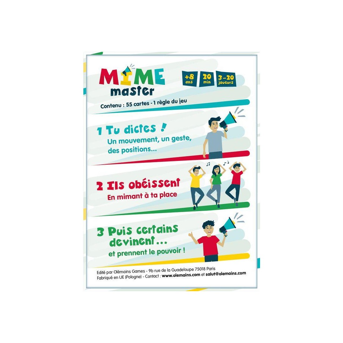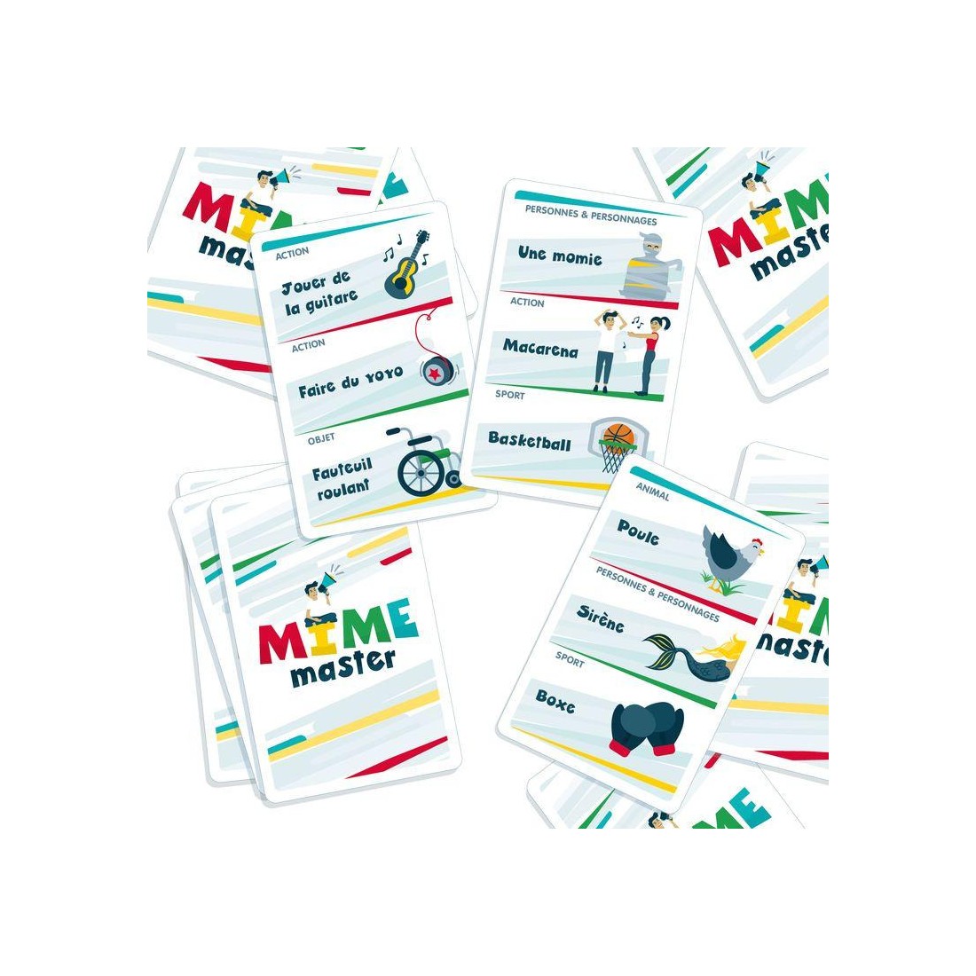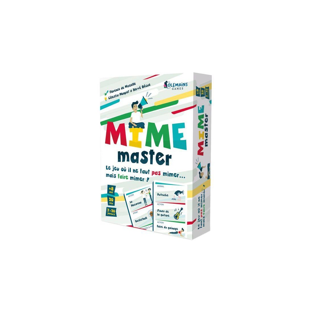 Mime Master, c’est le jeu où il ne faut pas mimer…. Mais faire mimer ! Le jeu d’ambiance qui révolutionne les jeux de mimes, pour une expérience unique et de grands moments de fous rires entre amis ou en famille.