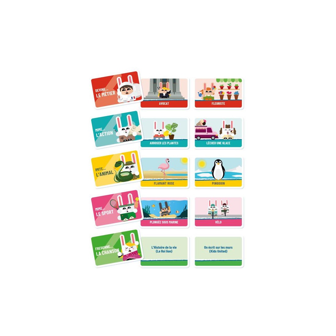 Mets une carte sur ton front, et les membres de ton équipe te font deviner le mot inscrit. Dès que le mot est trouvé tu en prends une autre. Tic tac tic tac, tu as très peu de temps pour trouver le plus de mots possibles. Puis aux suivants, c’est l’autre équipe qui joue sur le même thème !