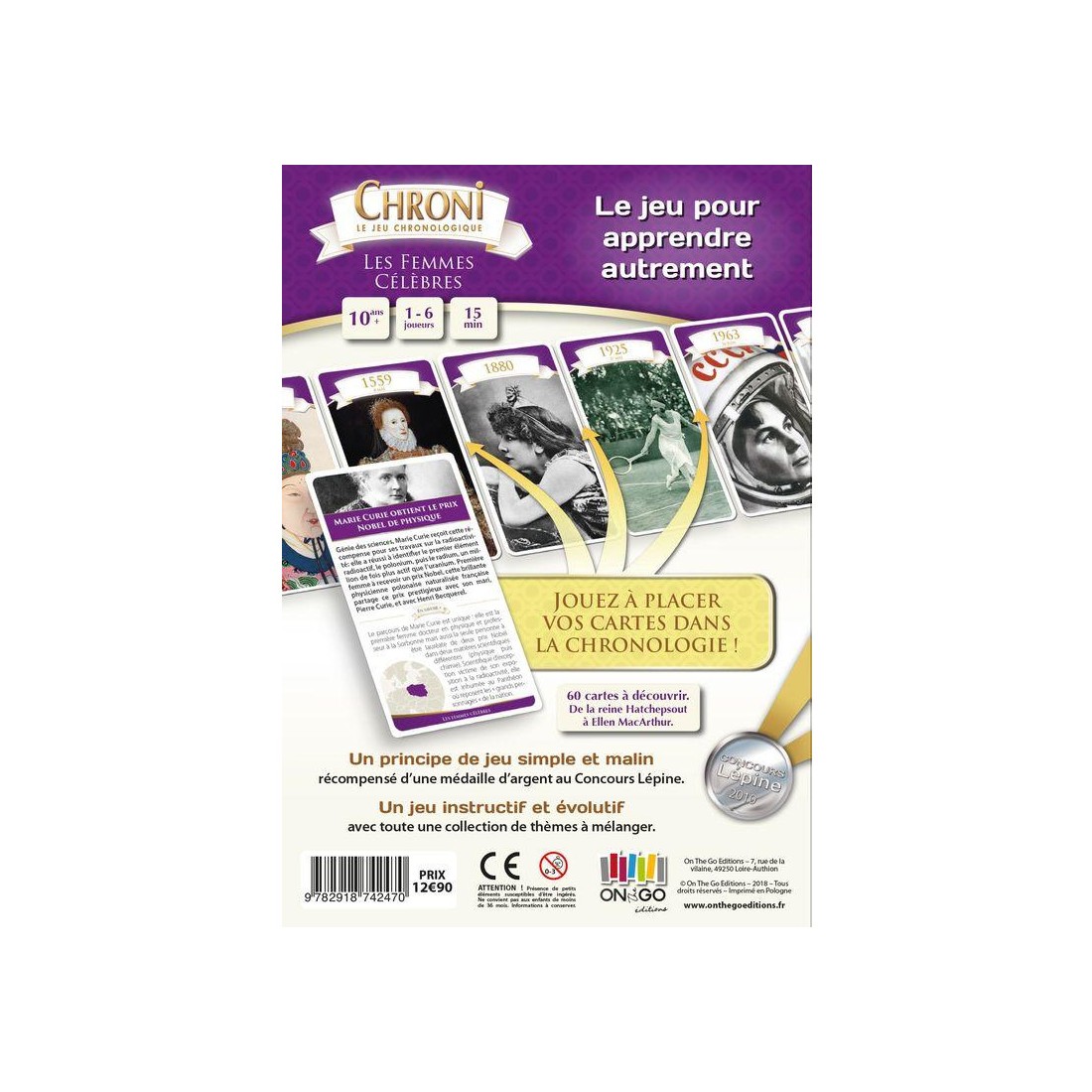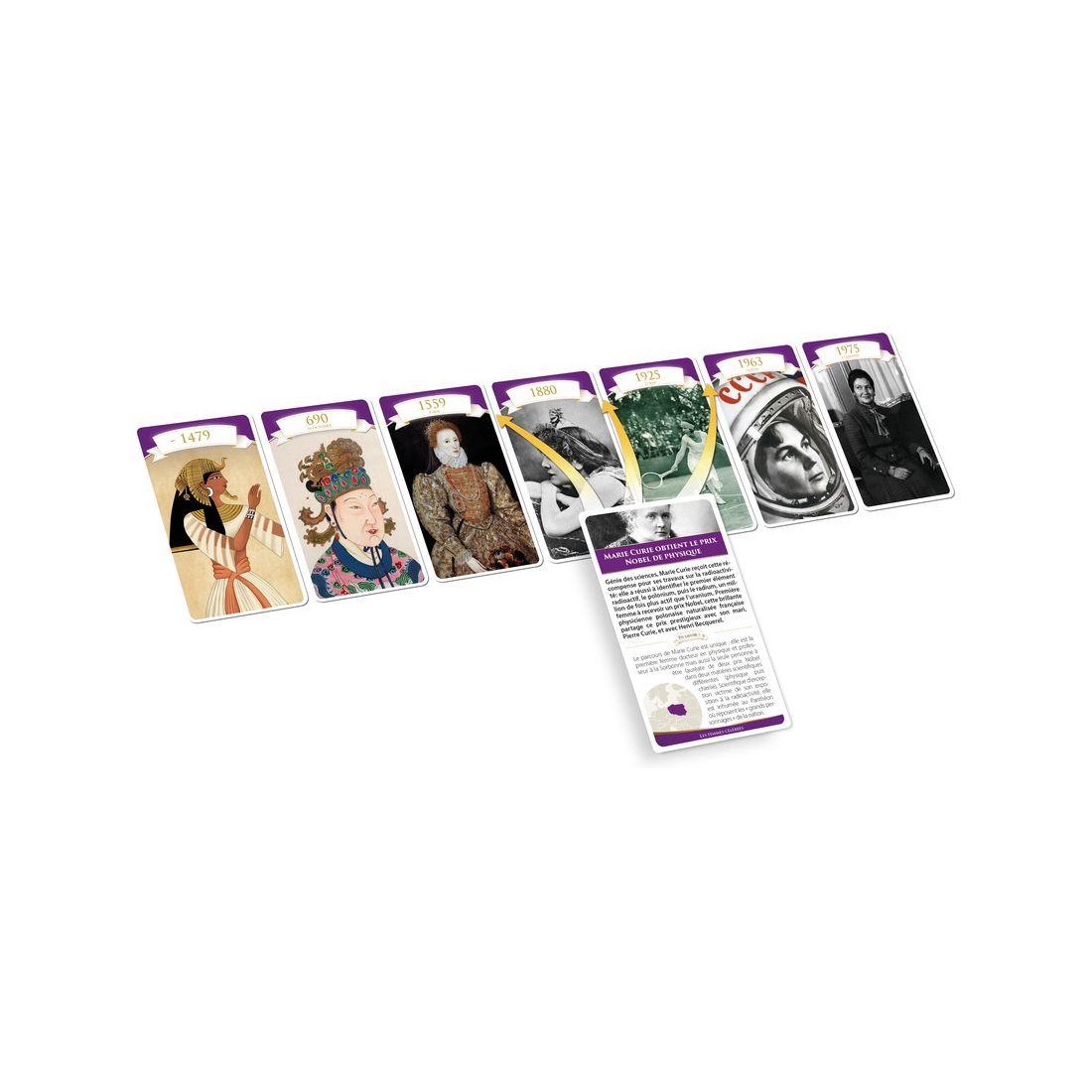Vous en apprendrez davantage sur ces femmes qui ont surmonté les préjugés de leur époque pour briller dans leur domaine respectif. Le principe de jeu est à la fois simple et ludique _récompensé d’une médaille d’argent au concours l’épie 2010_ ce qui en fait un excellent outil pour mémoriser progressivement et durablement les figures féminines marquantes de l’Histoire et découvrir leurs réalisations extraordinaires, souvent méconnues du grand public. À chaque tour, les joueurs tentent de placer une de leurs cartes dans la frise.