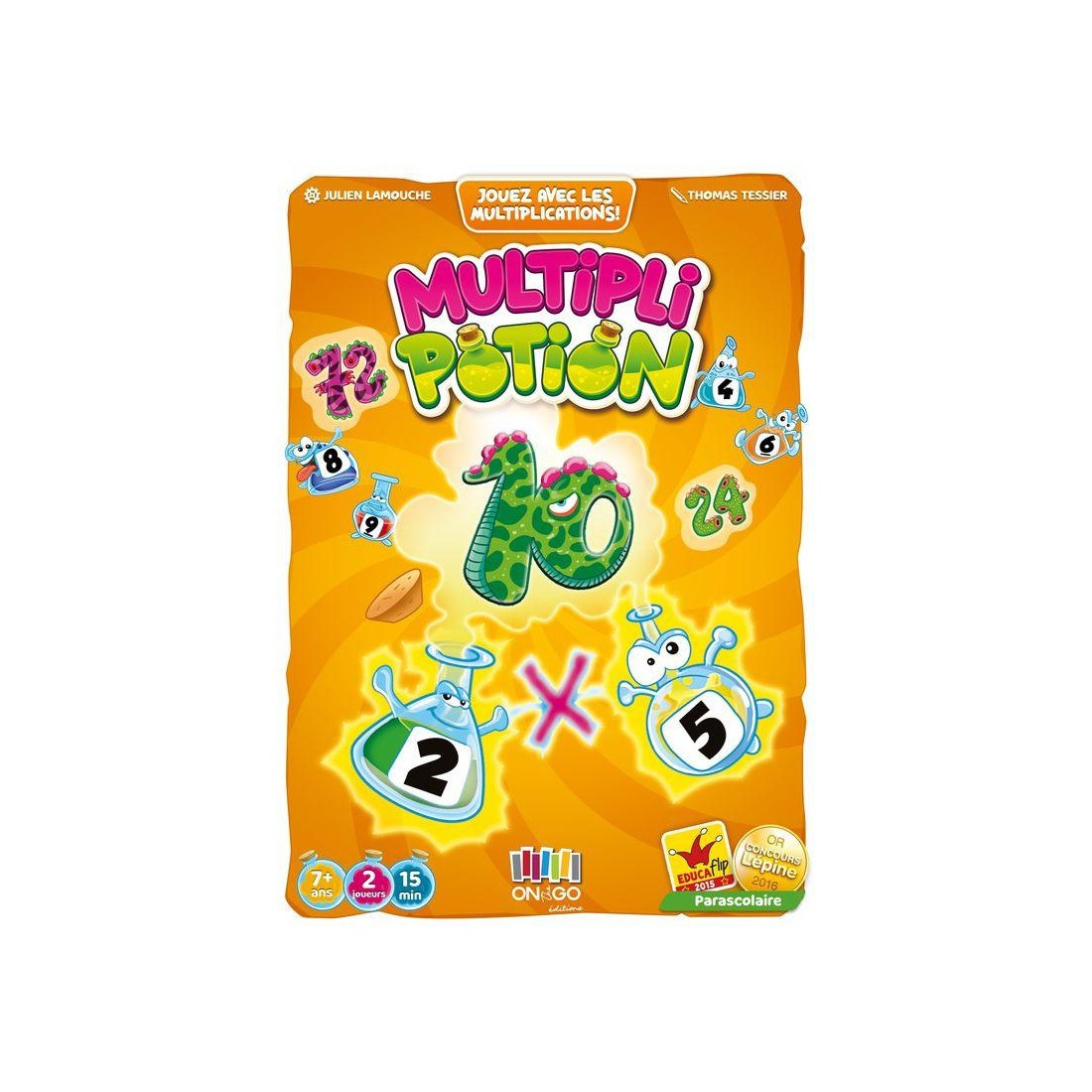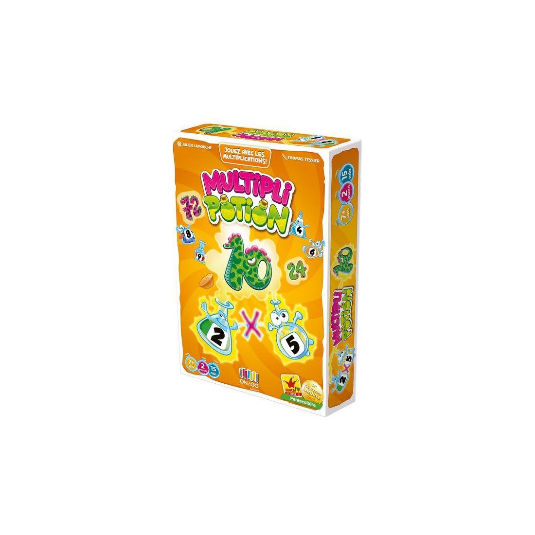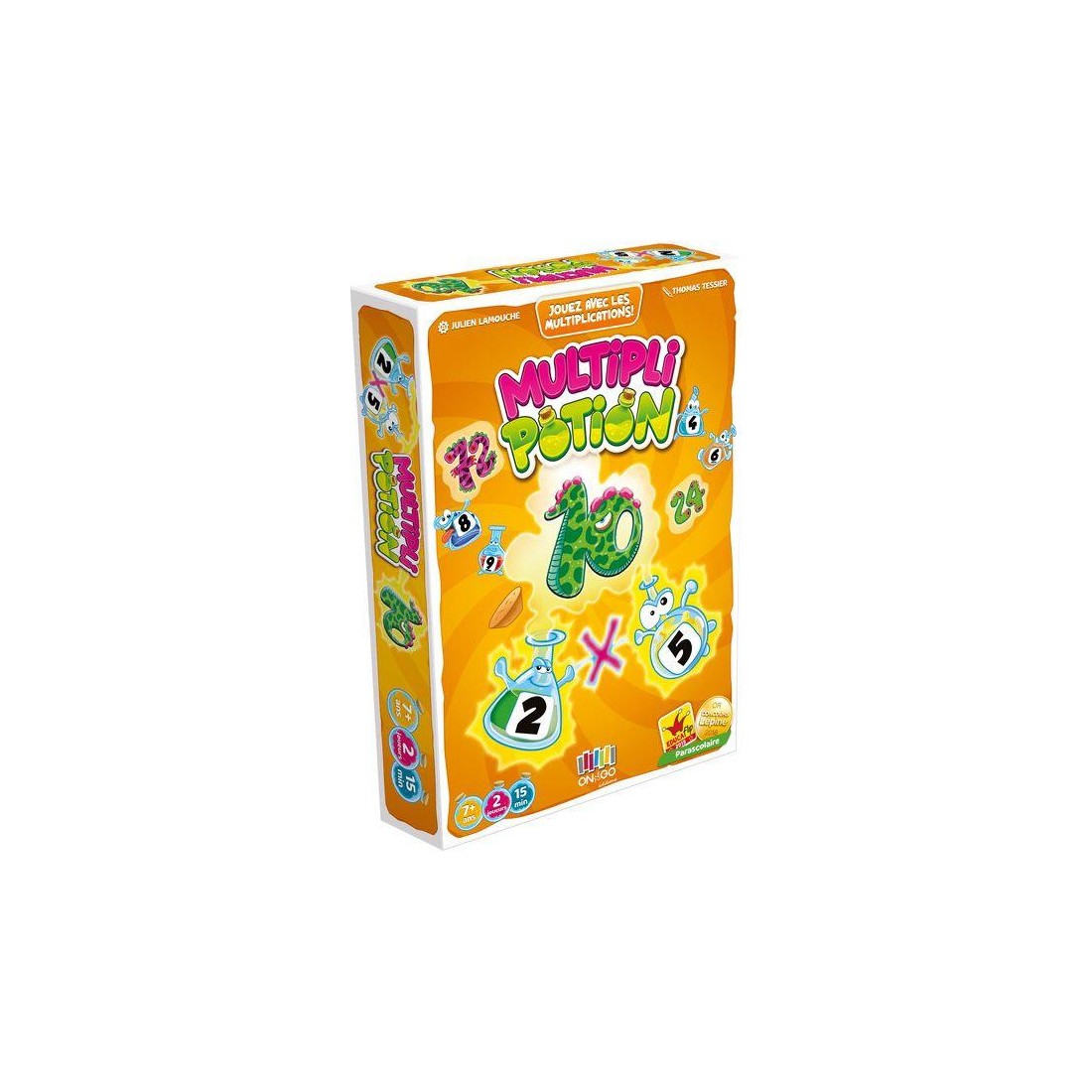 Multipli Potion est un jeu de cartes pour apprendre et réviser les tables de multiplication. Chacun leur tour, les joueurs posent une carte devant eux. Sur chaque carte, il y a une potion avec un chiffre (entre 2 et 9) et un monstre en forme de nombre (correspondant à un résultat présent dans les tables de multiplication).