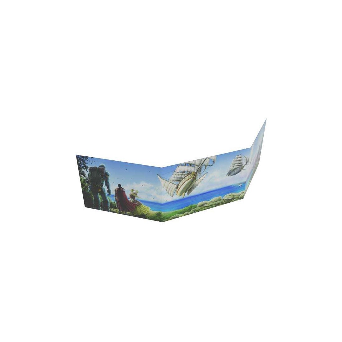Paravent cartonné pour Les Chants de Loss en 3 volet illustré par Axelle Bouet, avec des tables de jeu essentielles au verso.