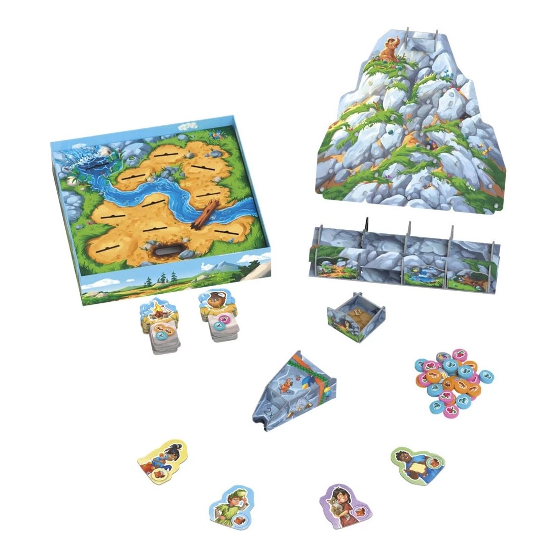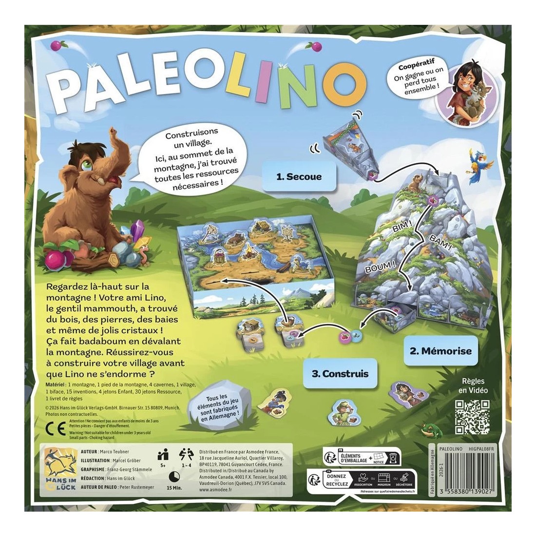 Regardez là-haut sur la montagne ! Lino le gentil mammouth, a trouvé du bois, des pierres, des baies et même de jolis cristaux. Secouez ces jetons du haut de la montagne et regardez-les dévaler la pente jusqu'aux cavernes, dans un joyeux tumulte. Vous allez pouvoir utiliser ses précieuses ressources pour construire ensemble le village, avant que Lino ne s'endorme. Spécialement conçu pour les enfants dès 5 ans, Paléolino les invite à partager une expérience ludique coopérative. À votre tour, vous secouez le "biface" pour récupérer deux jetons Ressource, puis vous les laissez dévaler la pente du sommet de la montagne. Observez attentivement dans quelles cavernes ils atterrissent : votre mémoire sera sollicitée au moment d’en ouvrir une et de récupérer son contenu. Les ressources collectées dans les cavernes permettent de construire des inventions, à condition de respecter les combinaisons indiquées sur les tuiles. Les cristaux jouent le rôle de jokers et offrent une flexibilité bienvenue. Chaque enfant dispose aussi d’un sac à dos pour conserver un jeton et pouvoir le sortir pour aider l’équipe au bon moment. La partie est remportée lorsque le village est terminé, c'est à dire quand 10 inventions sont achevées. Mais si vous n'avez plus de ressources, Lino s’endort et l’aventure s’achève. Manipulation, observation et entraide font de Paleolino une aventure immersive, rythmée et pleine de bonne humeur. 2 niveaux de difficulté différents vous permettront d'enchaîner les parties sans jamais vous lasser !