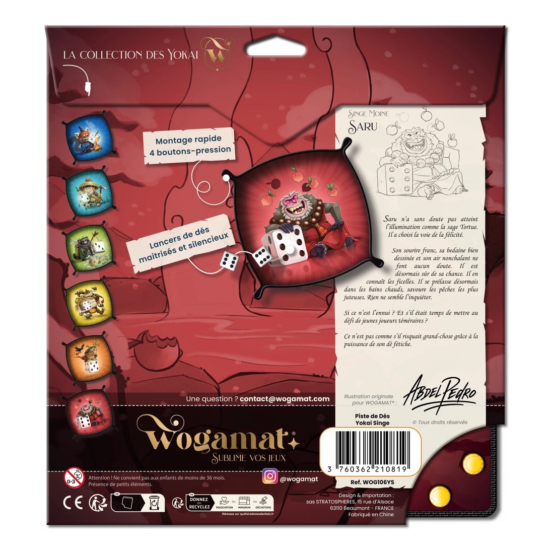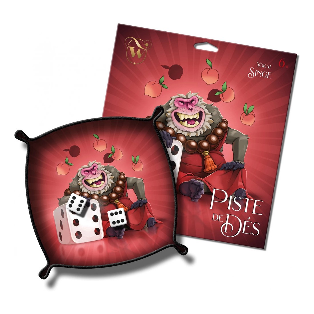 Cette simple amélioration rend les parties plus fluides, surtout lors de jeux où les lancers sont fréquents. Son format compact permet de l’intégrer facilement à n’importe quelle table sans encombrer votre espace de jeu. L’illustration signée Abdel Pedro apporte une vraie identité visuelle. Au cœur d’un univers inspiré des yokai japonais, Saru, le singe moine, espiègle et épicurien, donne une dimension narrative et chaleureuse à cet accessoire.