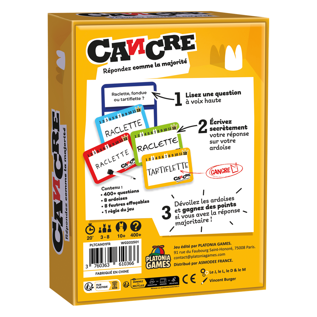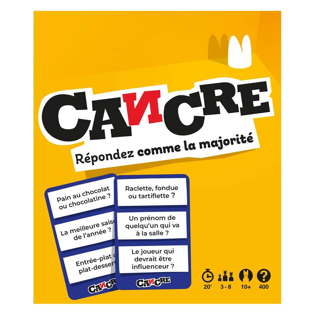 Cancre est un jeu d’ambiance pour 3 à 8 joueurs autour d'un concept simple : répondre comme la majorité. À chaque tour, un joueur lit une question à voix haute (ex. : « Raclette, fondue ou tartiflette ? »). Les autres écrivent leur réponse secrètement sur leur ardoise. Ensuite, tout le monde révèle sa réponse.