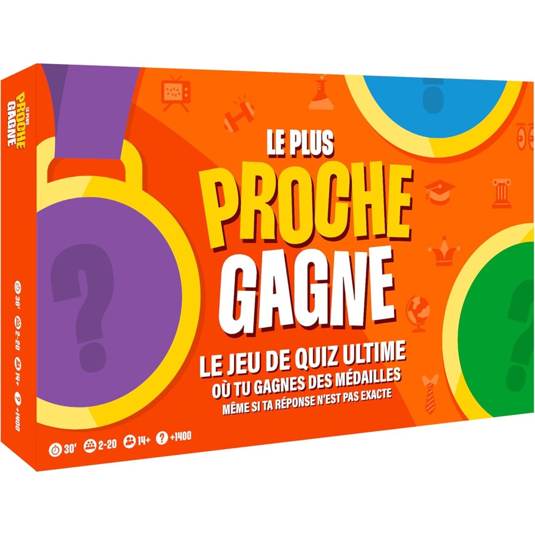 Dans Le Plus Proche Gagne toutes les réponses sont des nombres. Pas besoin de connaître la réponse exacte, il faut seulement s’en rapprocher le plus possible !Deviens le champion d’une catégorie en remportant la médaille associée ! 9 médailles pour 9 catégories différentes : L’AthlÈTe, Le Globe-Trotteur, Le Fan, L’ÉRudit, Le Loufoque, L’Historien, L’Observateur, Le Ministre, Le Scientifique.