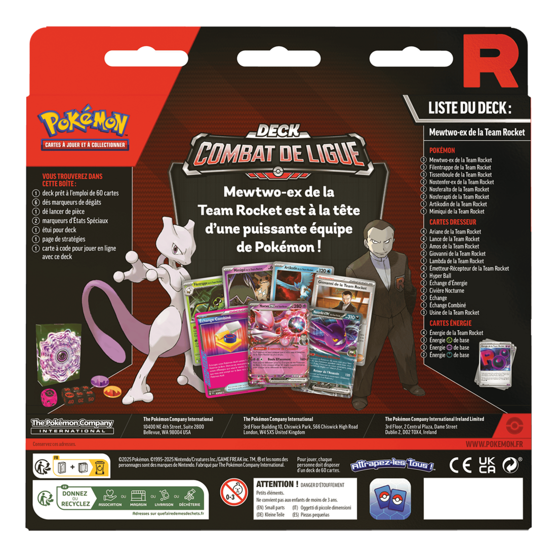 Montrez votre côté sombre en affrontant vos adversaires avec une équipe de puissants Pokémon menés par Mewtwo-ex de la Team Rocket. Ce Deck Combat de Ligue est un deck de 60 cartes prêt à l’emploi du Jeu de Cartes à Collectionner contenant de nombreux Pokémon de la Team Rocket et membres de cette infâme organisation en tant que cartes Dresseur. Que vous jouiez gentiment//en toute bienveillance ou que vous combattiez d’une façon plus fourbe, vous aurez toute la puissance de la Team Rocket à vos côtés avec ce Deck Combat de Ligue.Ce Deck Combat de Ligue Mewtwo-ex de la Team Rocket du Jcc Pokémon contient :