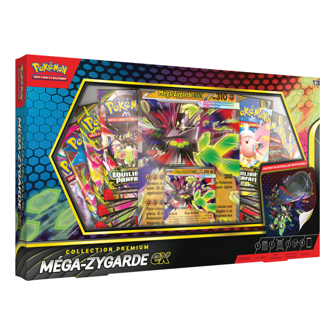 Plus puissant que jamais, le légendaire Zygarde surprend en devenant un Pokémon-ex Méga-Évolution ! Ses puissantes attaques peuvent détruire la stratégie de votre adversaire en infligeant de nombreux dégâts à ses Pokémon.