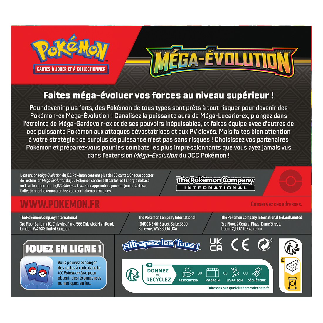 Contenu : Chaque booster de l'extension Méga-Évolution du Jcc Pokémon contient 10 cartes, 1 énergie de base ou 1 carte à code pour le Jcc Pokémon Live.