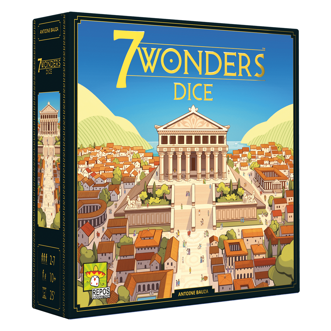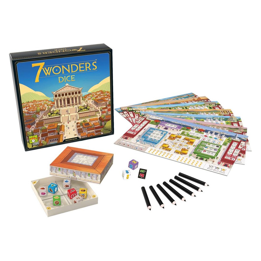 Dans 7 Wonders Dice, chaque joueur fait prospérer sa cité antique en lançant des dés et en construisant bâtiments et Merveille.