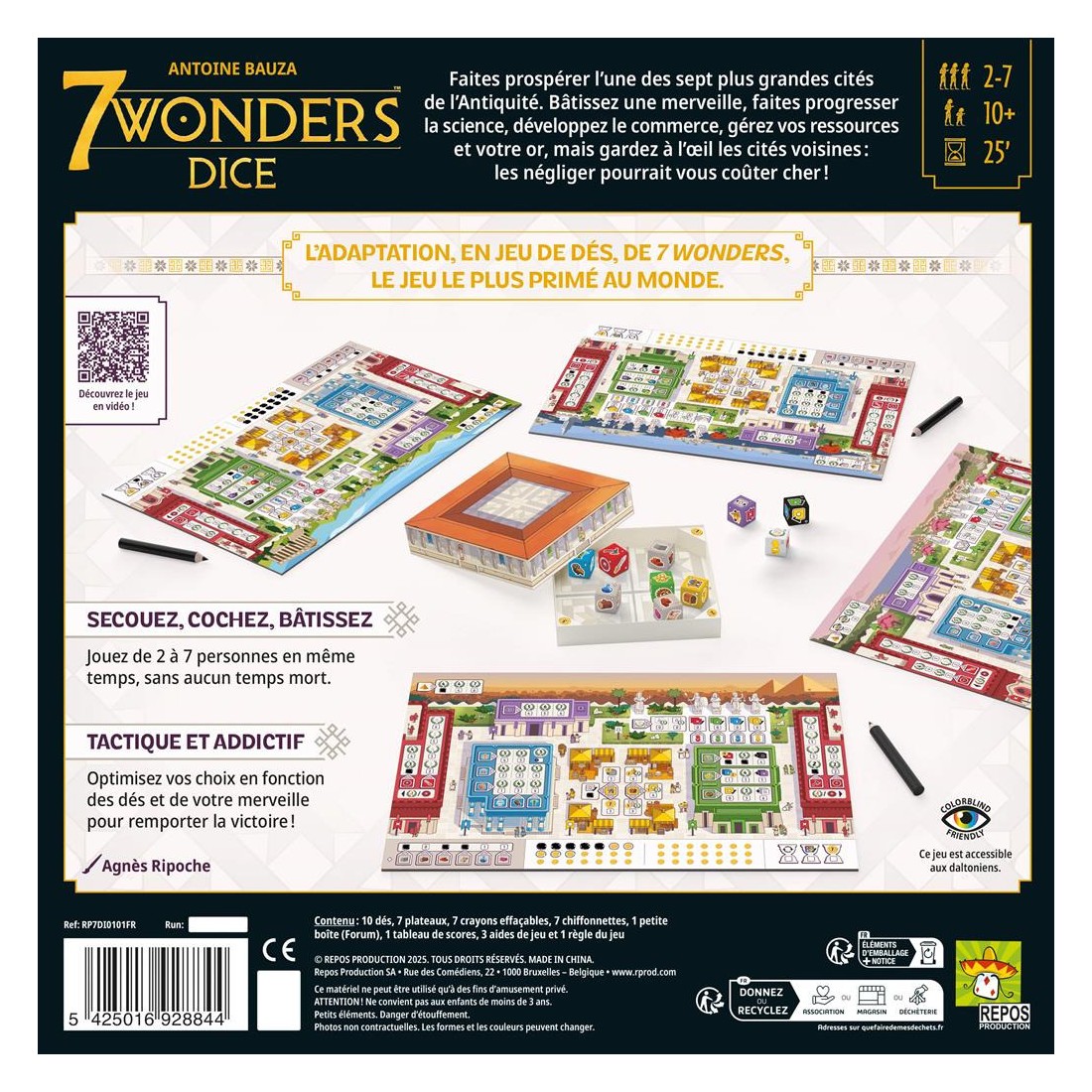 Dans 7 Wonders Dice, construisez une merveille qui défie le temps, faites des progrès scientifiques, développez le commerce, gérez vos ressources et votre réserve d'or avec prudence, tout en gardant un œil sur les villes voisines, car les ignorer se paie très cher ! Grâce à un système de choix simultané et des actions variées, ce roll & write offre des parties dynamiques, pleines de dilemmes stratégiques. N’oubliez pas de surveiller les cités voisines !Une partie se déroule en plusieurs tours au cours desquels vous utilisez des dés pour construire votre ville. À la fin de la partie, comptez tous vos points pour savoir qui a le score le plus élevé. Contenu: