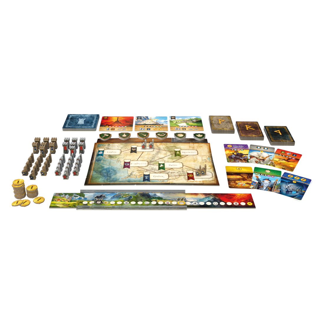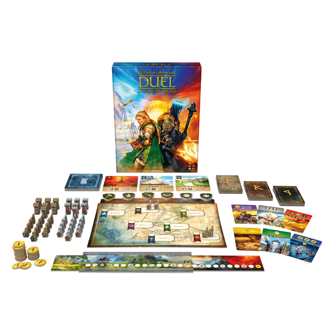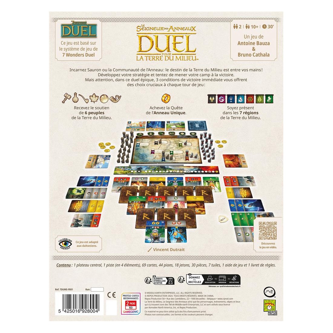 Vous remportez immédiatement la partie en remplissant l’une des 3 conditions de victoire : accomplir la Quête de l’Anneau (ou rattraper Frodon), rassembler le soutien de 6 Peuples différents, ou conquérir la Terre du Milieu. Un jeu s’inspirant des mécaniques de 7 Wonders Duel. Contenu