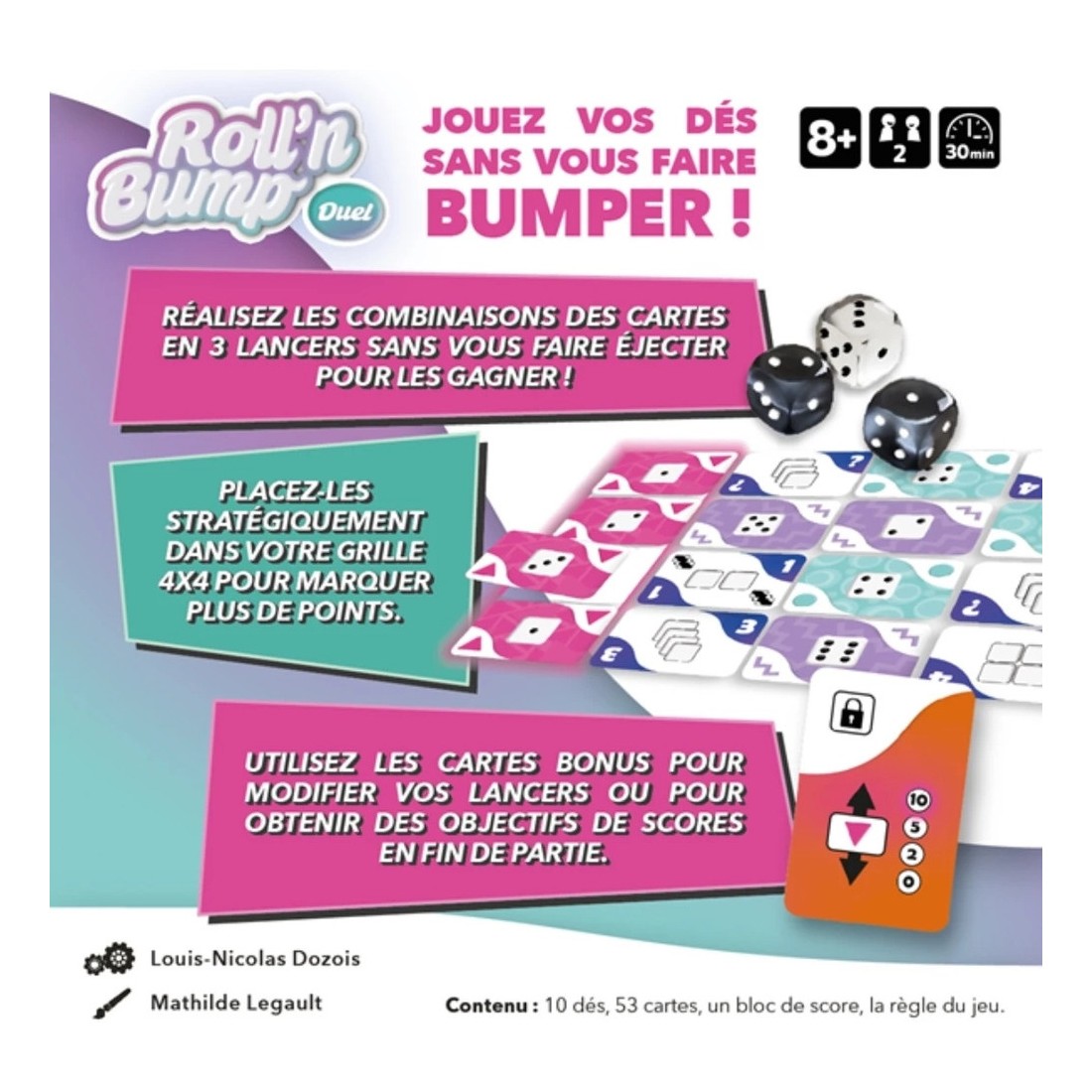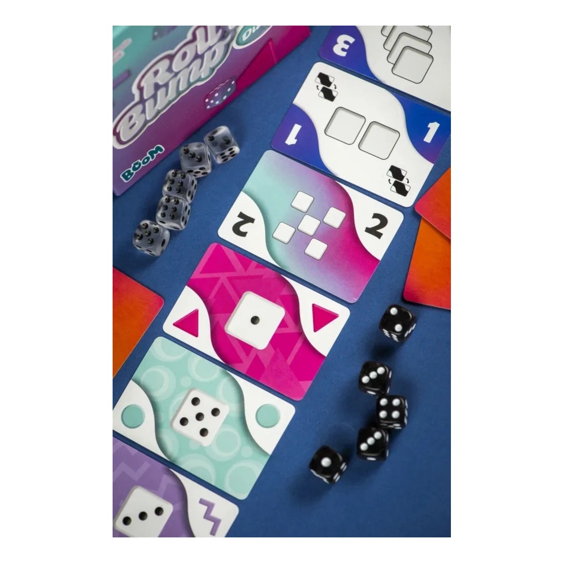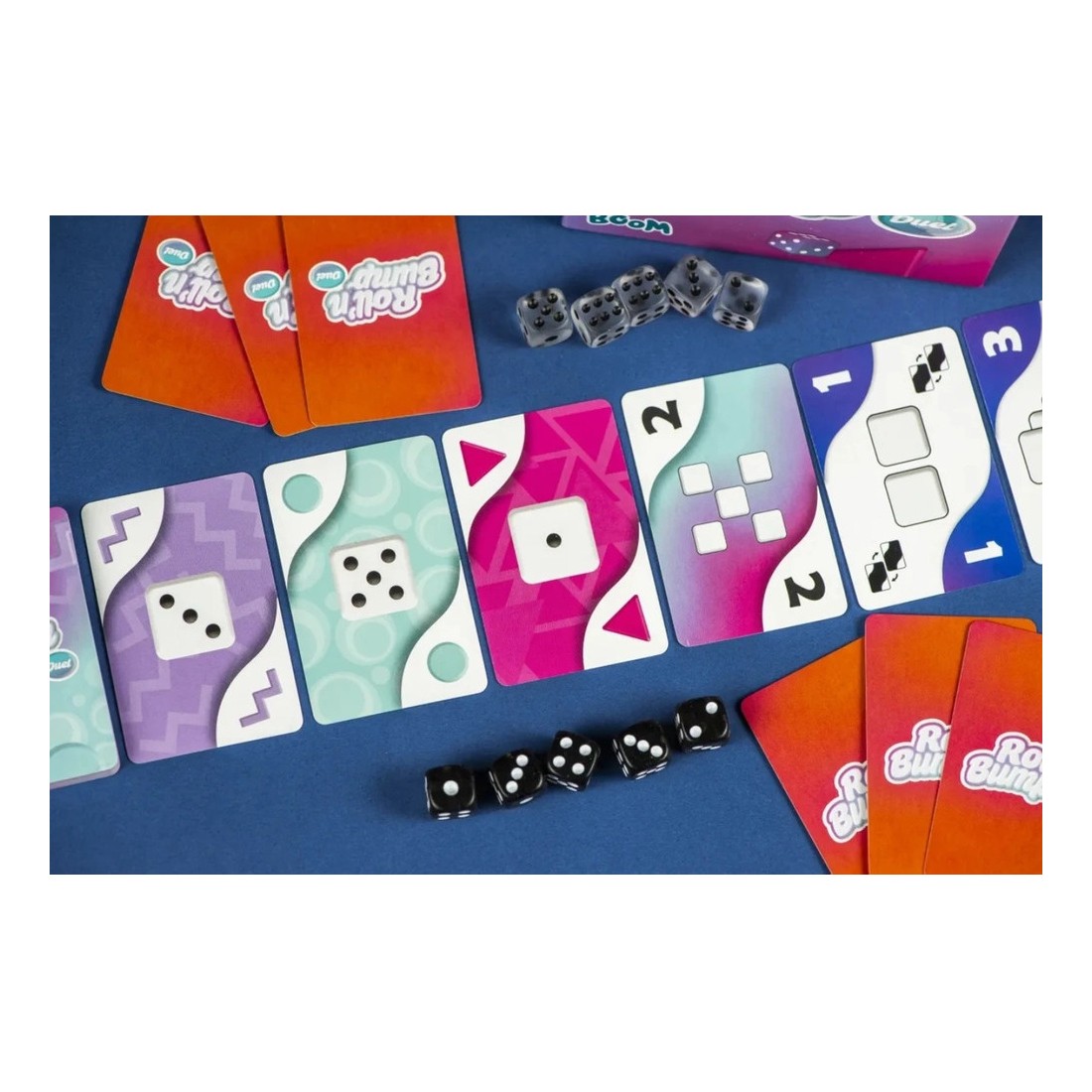 Construisez votre tableau final grâce aux cartes que vous avez gagnées aux dés, et n'oubliez pas de "bumper" votre adversaire pour contrarier ses plans! Différentes combinaisons vous permettent d'obtenir des cartes Couleur ou des cartes Points qui vous octroieront peut-être la victoire en fin de partie.