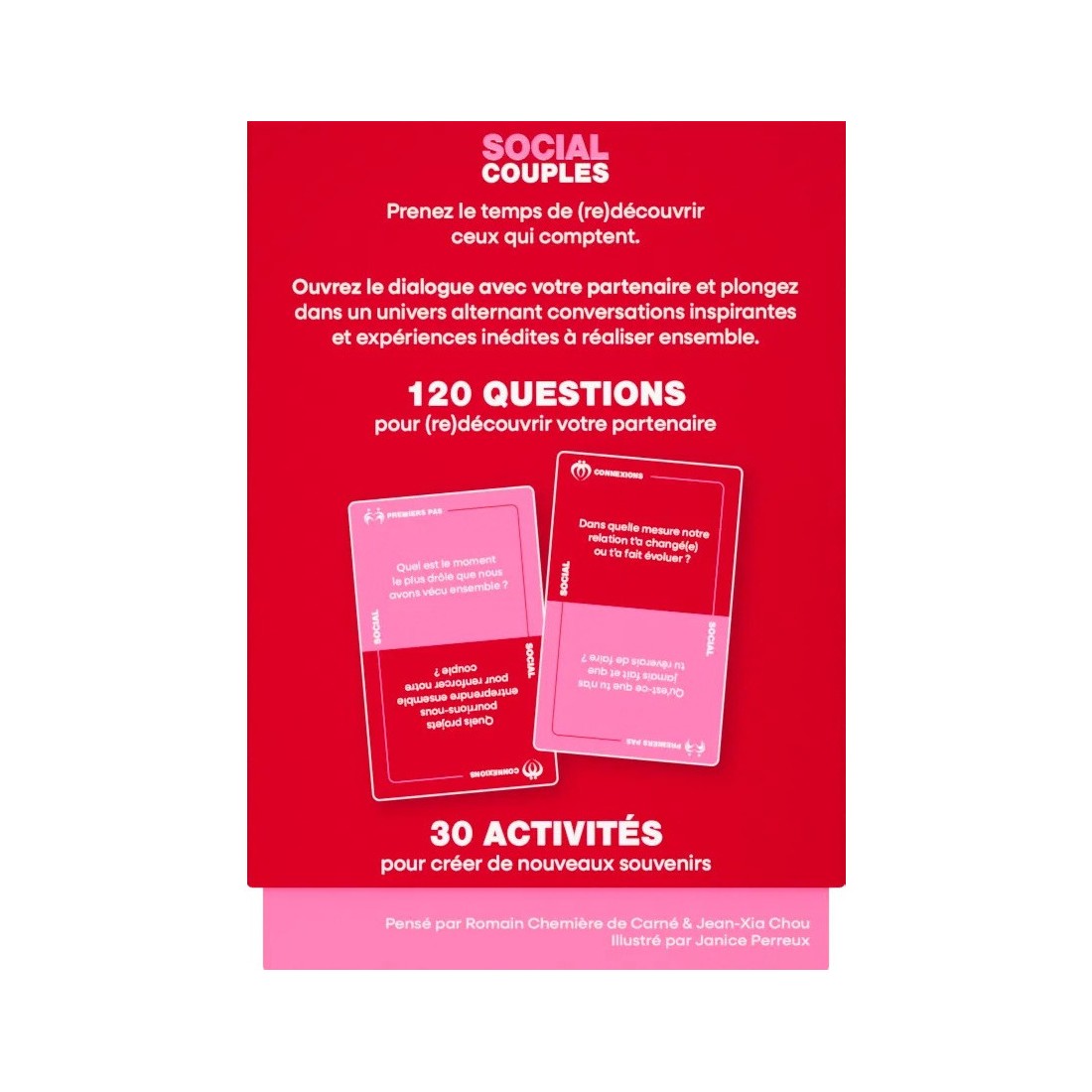 Social Couples, c'est 110 questions, pour 110 grandes discussions ! Pas de règles, un jeu de société où le seul gagnant sera le couple : Laissez-vous guider et revivez vos plus beaux souvenirs, partagez vos émotions, et construisez vos plus beaux projets ! Alors, qu'attendez-vous pour (re)découvrir votre partenaire ?