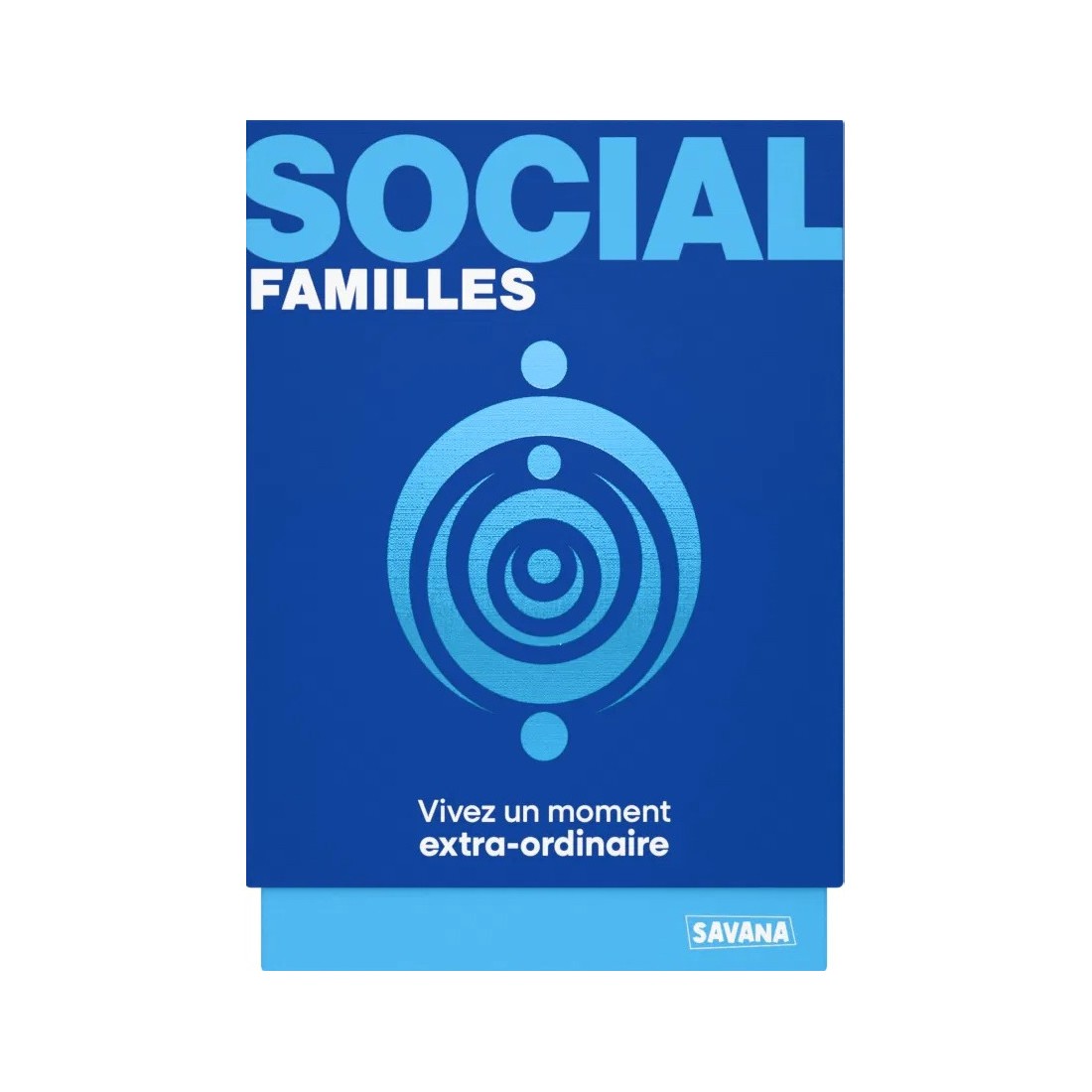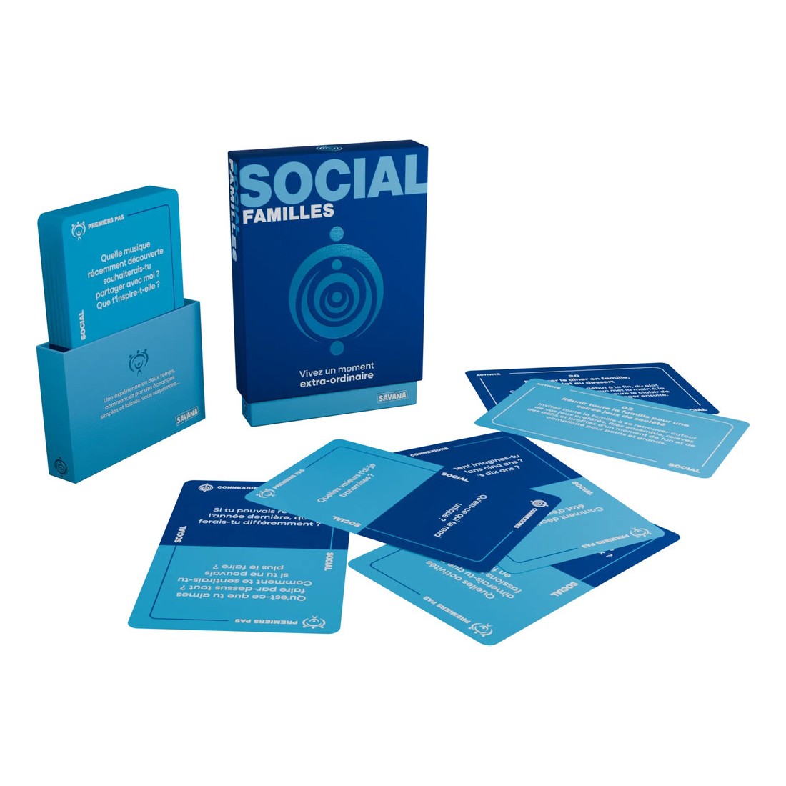 Social Familles est un jeu de société d'ambiance jouable de 2 à 12 joueurs, dès 6 ans pour des parties d'environ 30 minutes, édité par Savana. Ici le concept simple, ludique et universel du jeu de carte déclencheur de grandes discussions. Social Familles est un jeu de cartes pour nourrir de belles discussions en famille, développer la complicité avec ses enfants, renforcer les liens familiaux !