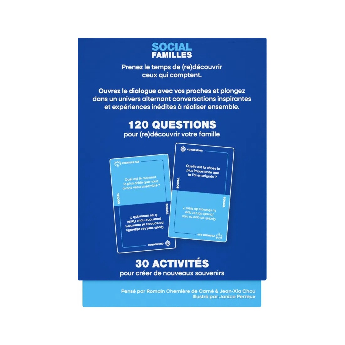 Lors d’un dîner, d’un voyage, d’un trajet en voiture, d’un week-end ou en vacances en famille, (re)jouez à volonté, où vous voulez, et laissez la magie opérer : éclats de rire, surprises et nostalgie garantis ! Social Familles est un jeu idéal à offrir en cadeau à sa famille, ses enfants, sa femme ou son homme.