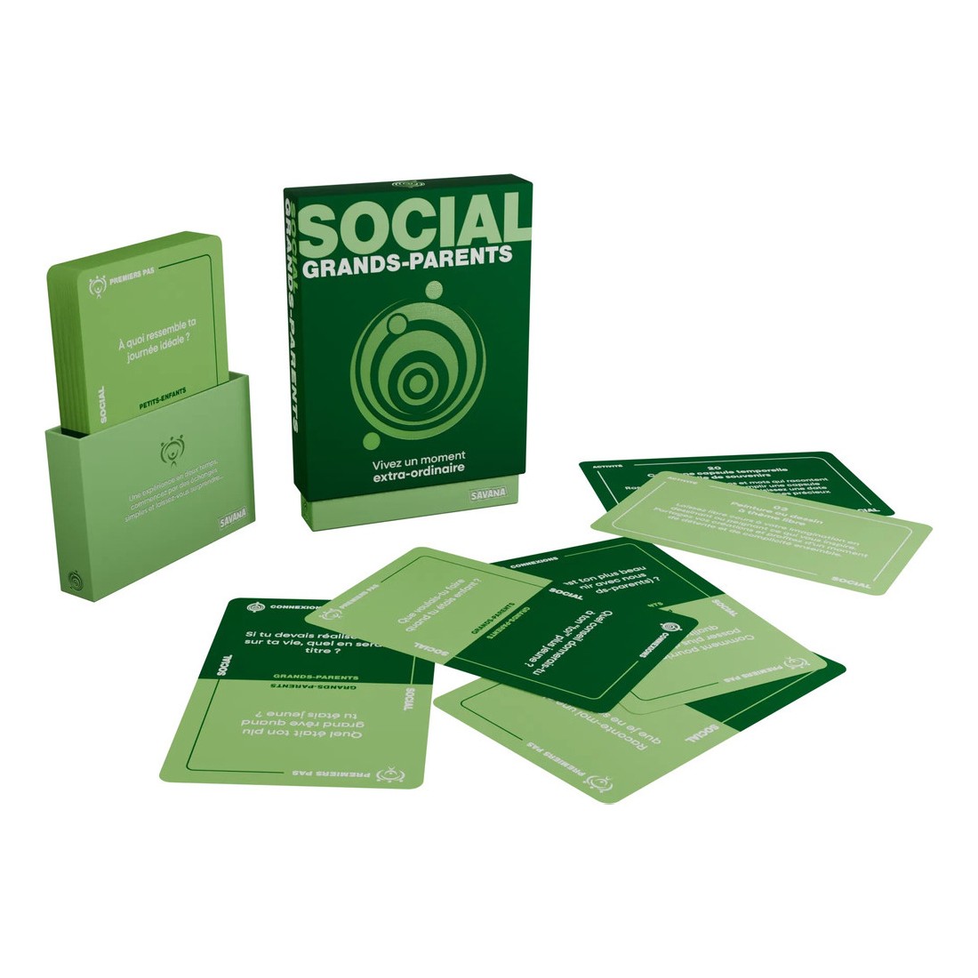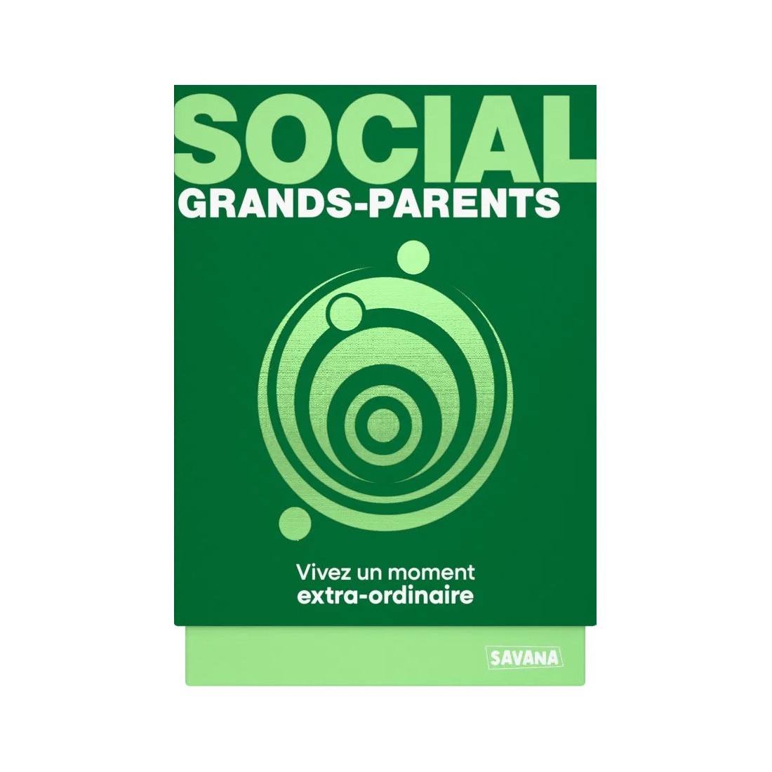 Social Grands-parents est un jeu de société d'ambiance jouable de 2 à 12 joueurs, dès 6 ans pour des parties d'environ 30 minutes, édité par Savana.