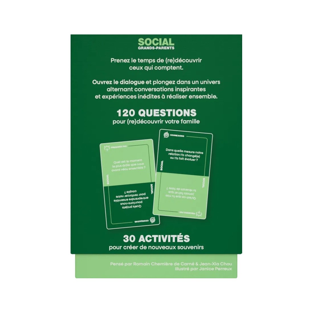Social Grands-Parents contient également 30 activités à réaliser, pensées pour créer de nouveaux souvenirs et partager des moments uniques entre générations. Chaque partie devient ainsi un moment convivial, amusant et enrichissant pour toute la famille.