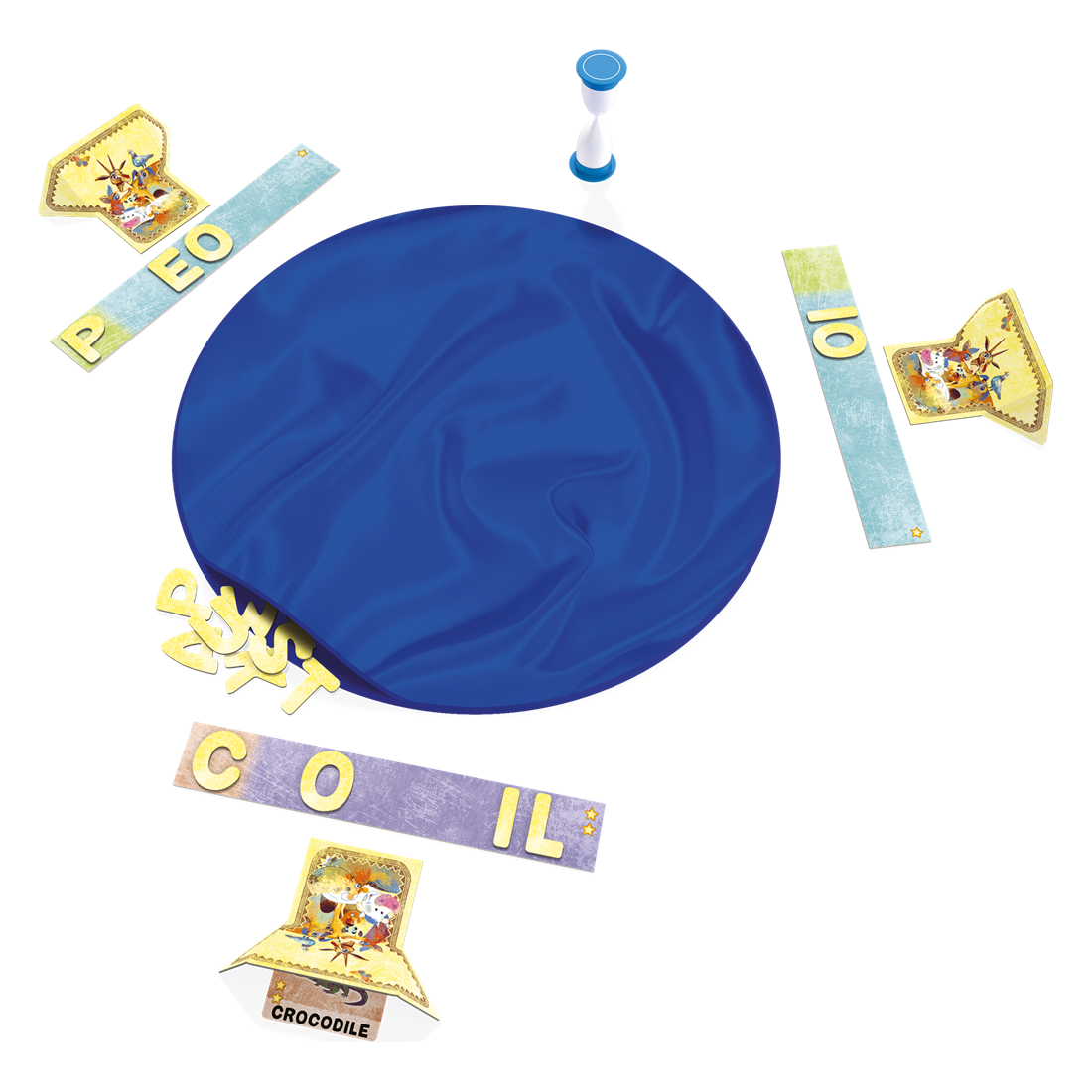 Après leur bain quotidien dans le lac Komentutapel, un phénomène étrange s’est produit : les animaux ont oublié leur nom ! Aidez-les à le retrouver ! À chaque manche, piochez une carte Animal facile ou difficile, que vous devrez faire deviner. Pour cela, au signal, tous les joueurs plongent la main dans le sac et essayent de trouver des lettres, grâce à leur sens du toucher, pour compléter au maximum le nom de leur animal. Au top, c’est fini, tout le monde retire sa main et réagence au mieux ses lettres sur son plateau. Ensuite, animal par animal, les autres joueurs doivent deviner quel animal le joueur tentait de reconstituer. Chaque réussite permet d’acculer des étoiles. À la fin de la 5e manche, comptez le nombre d’étoiles remportées tous ensemble et évaluez votre score. Serez-vous aussi bon que le lion ? Contenu- 82 lettres en carton